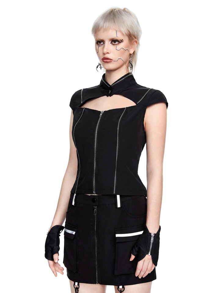 Grunge Punk Blusa slim fit con diseño calado, parche y cremallera de metal con estilo ciberpunk para mujeres