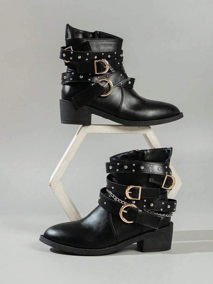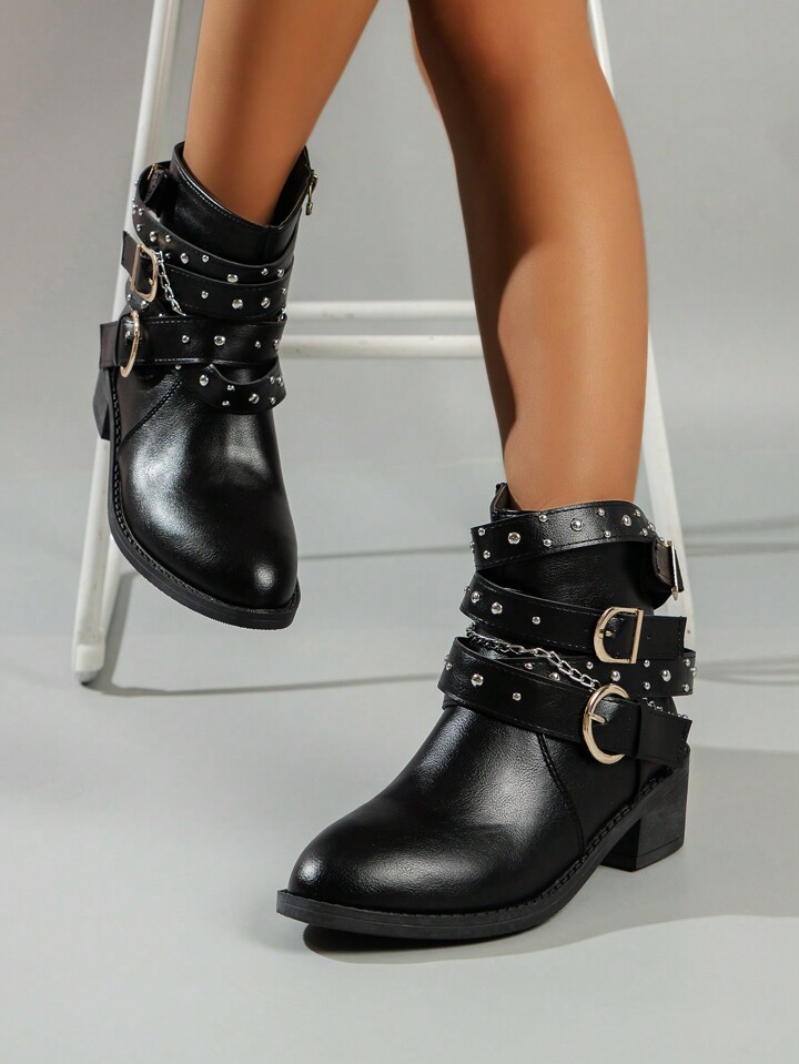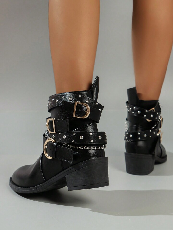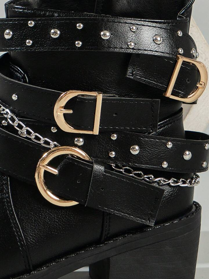 Grunge Punk Botas asimétricas tipo tubo corto de tacón alto con diseño de correa con remaches, estilo retro europeo y americano, de aspecto de caballero apuesto y de estilo punk oscuro y fresco