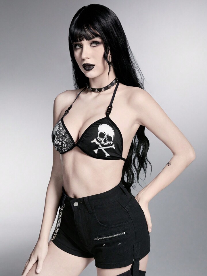 Grunge Punk Bralette con cuello de halter con cordones, impresión de calavera gótica oscura