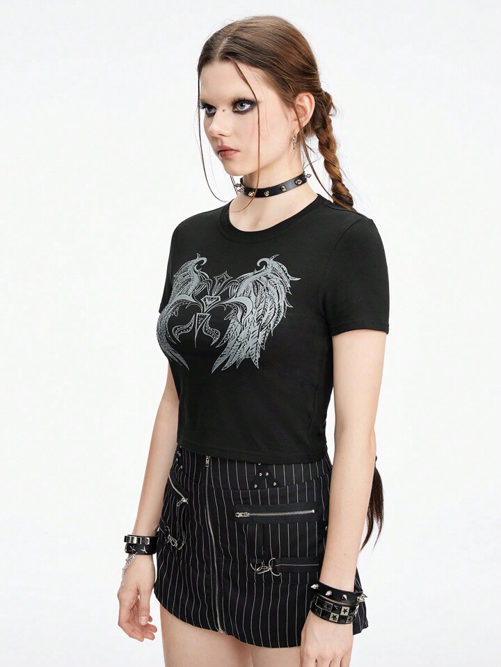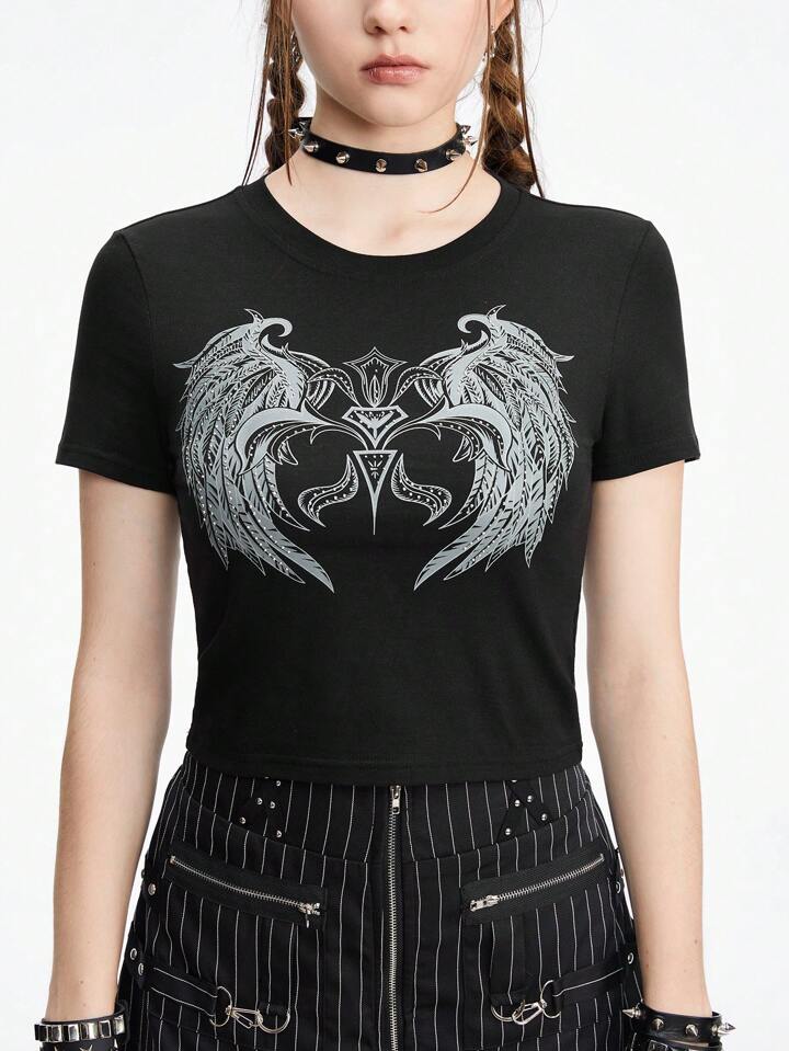 Grunge Punk Camiseta básica de mujer ajustada con impresión de alas punk oscuras y diamantes de imitación