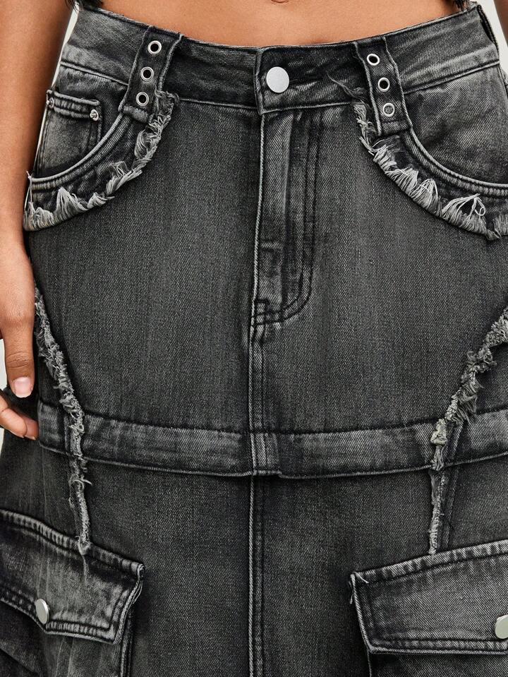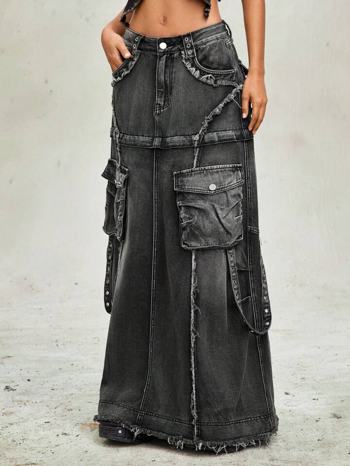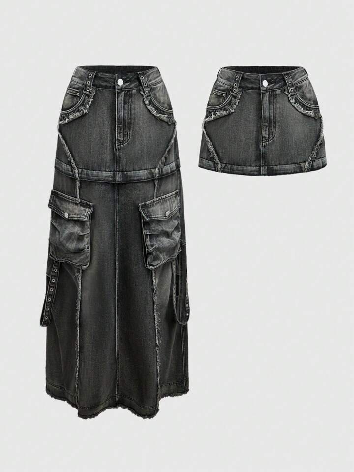Grunge Punk Falda vaquera larga y versátil con diseño desmontable y efecto desgastado estilo punk para mujeres