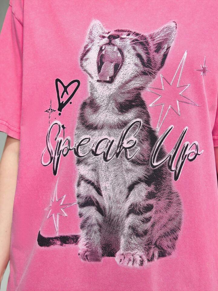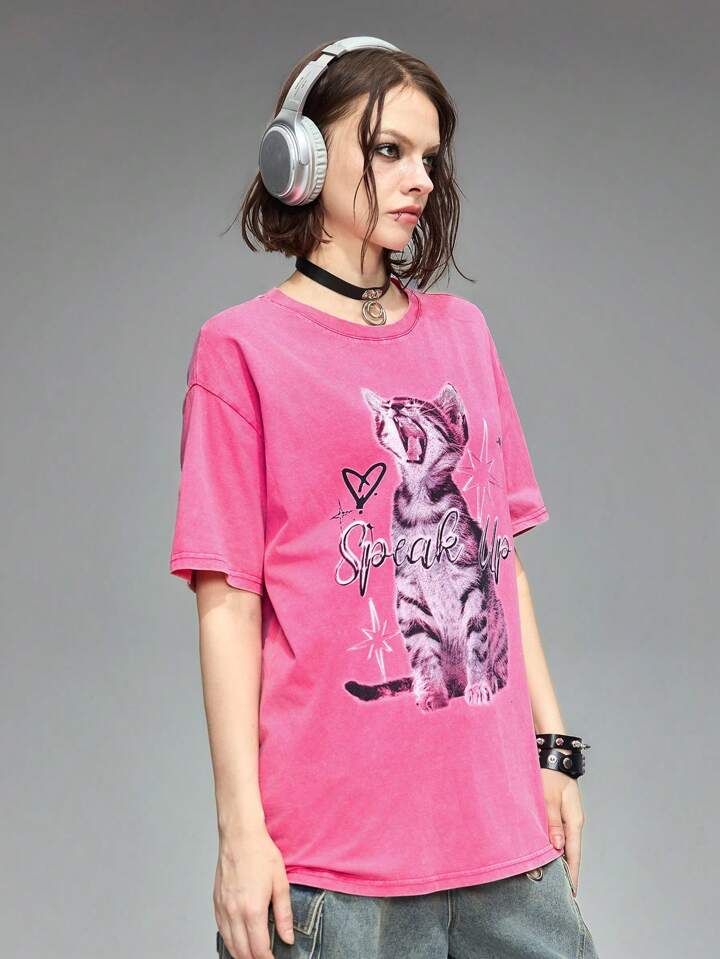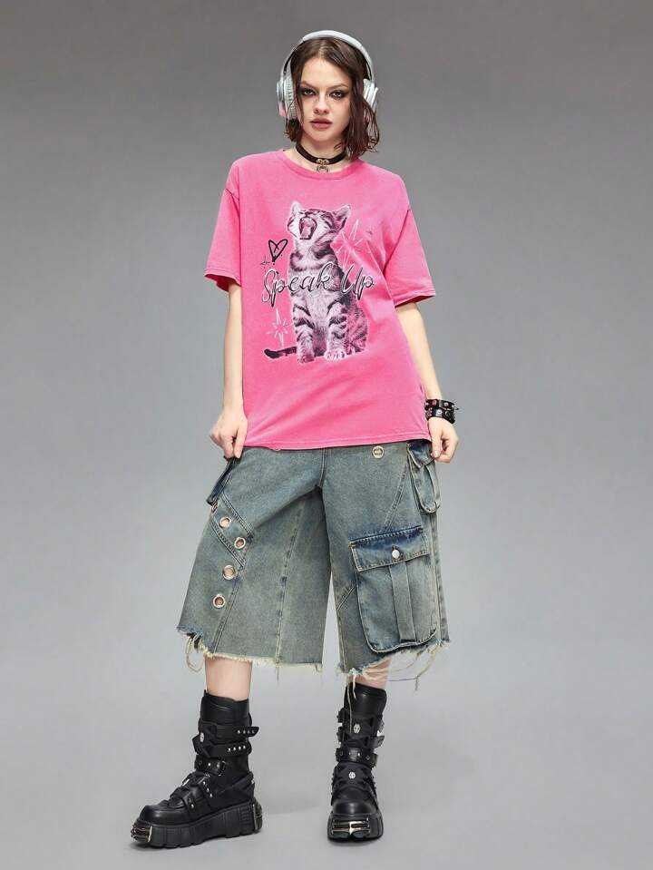 Grunge Punk Camiseta holgada con estampado de gato y efecto lavado y desgastado con diseño de copos de nieve, conjunto de verano para mujer