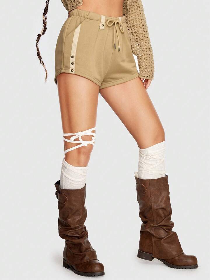 Grunge Punk Shorts de cintura con cordón en contraste lado