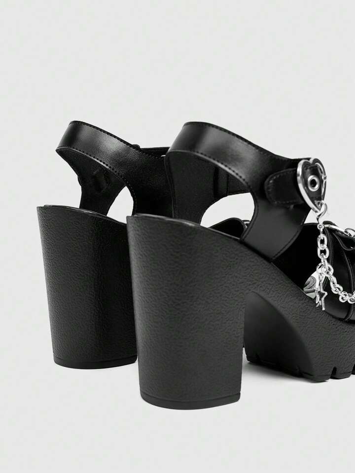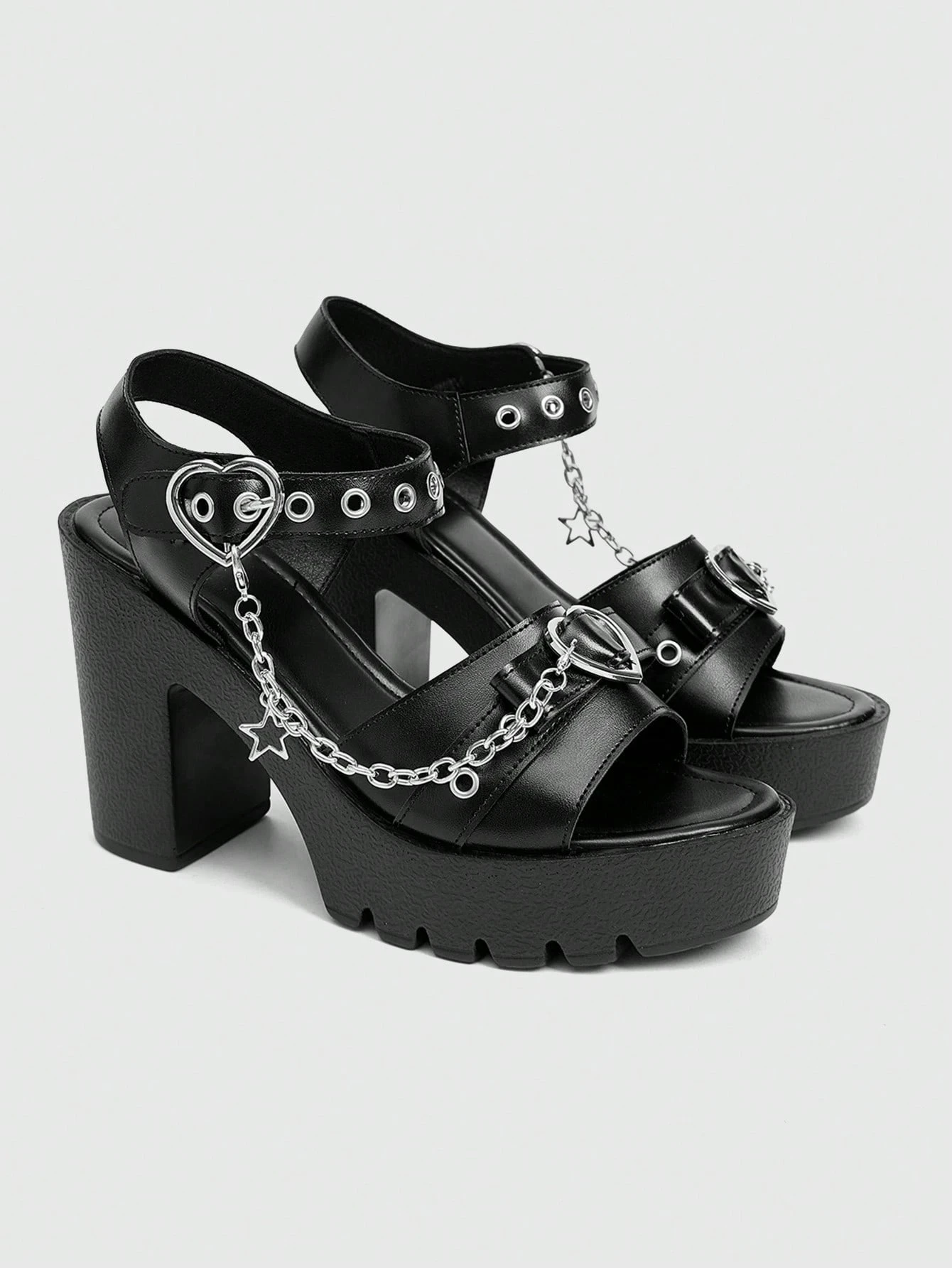 Grunge Punk Sandalias de tacón alto con plataforma y diseño de cadena metálica con forma de corazón y estrella para mujer, estilo punk con puntera redonda, sandalias romanas adecuadas para fiesta, uso diario, vestido de noche, que aumentan la altura y estilizan las piernas, cómodas y versátiles tacones altos para damas