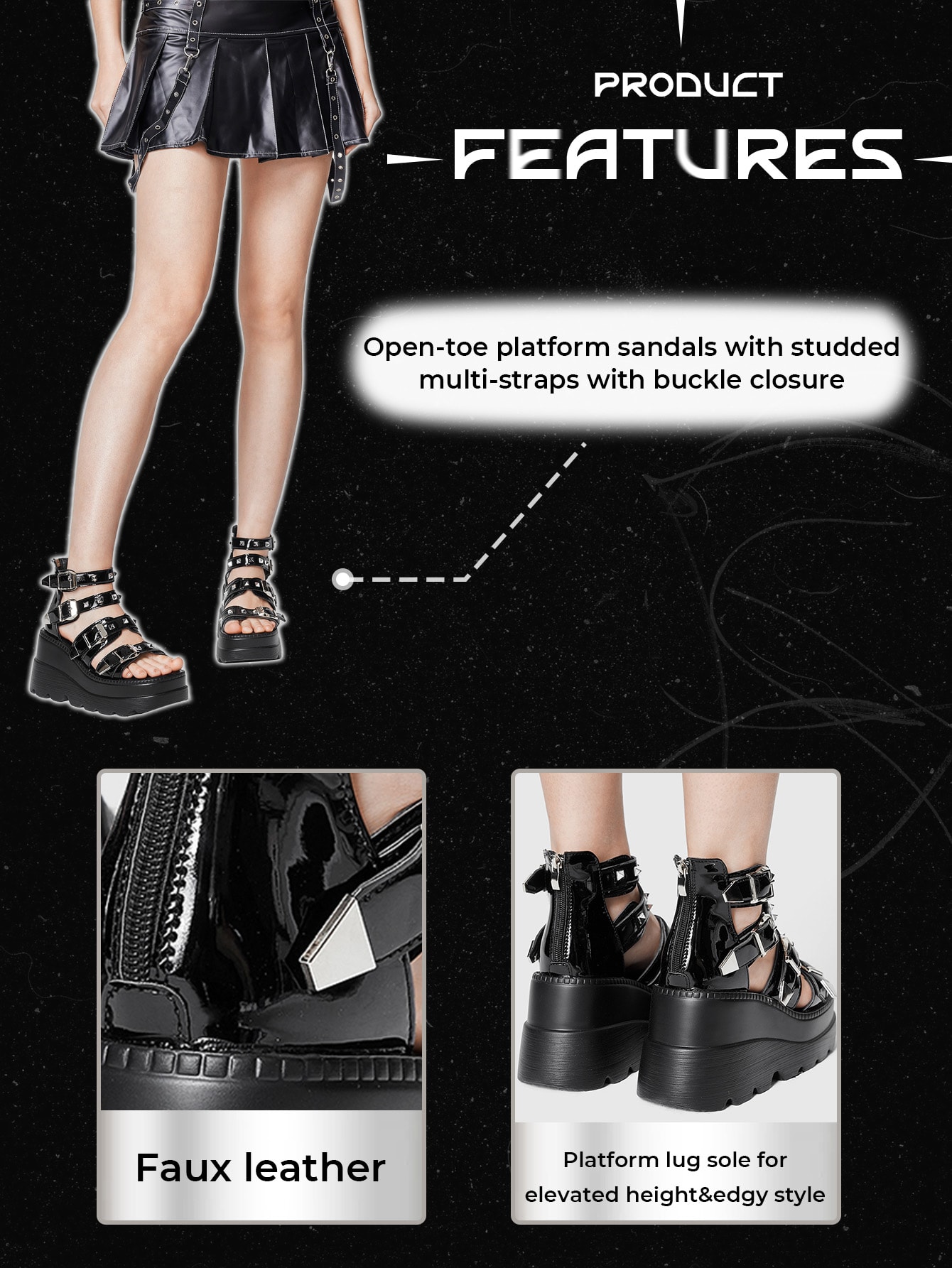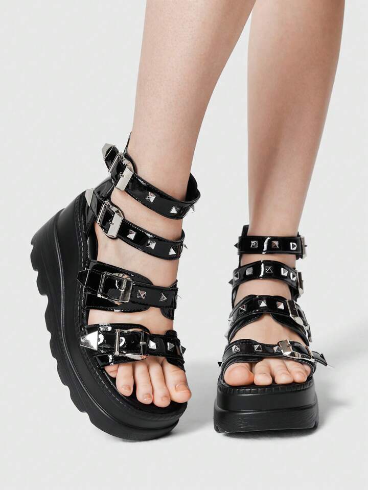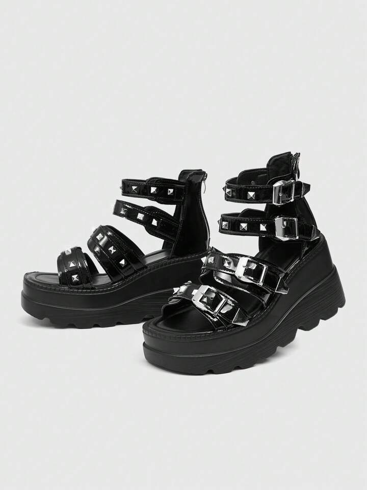 Grunge Punk Sandalias negras de PU retro con hebilla metálica, diseño de punta abierta, plataforma gruesa y tacón de 7,5 cm, adecuadas para salidas de verano y citas