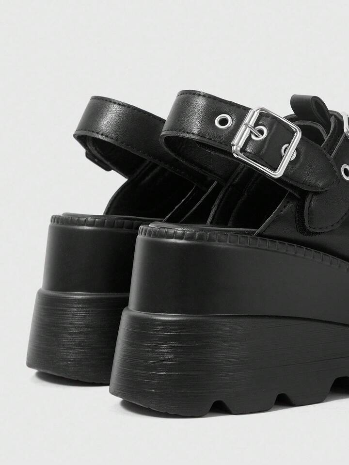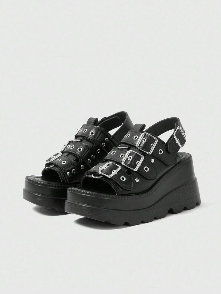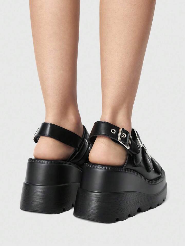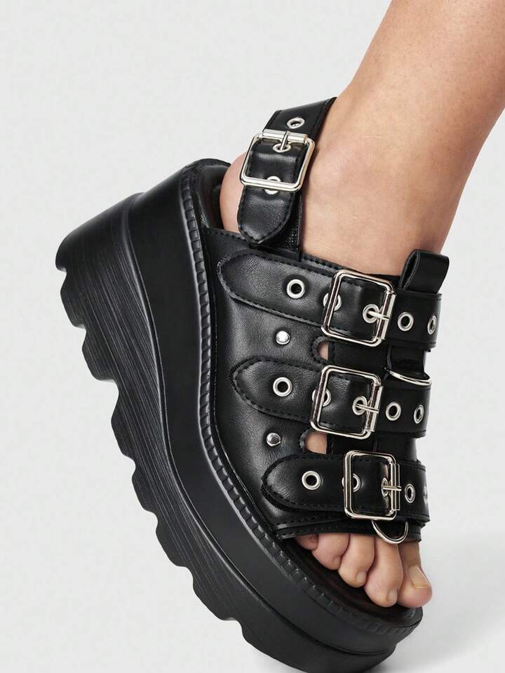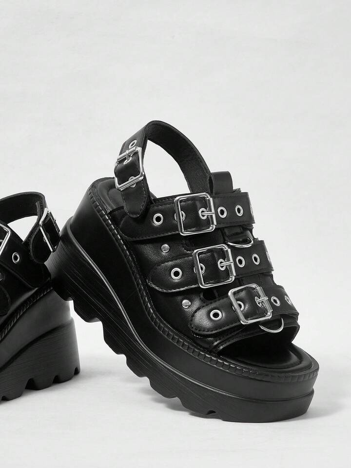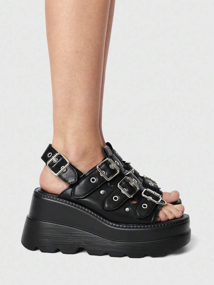Grunge Punk Sandalias negras (PU) con hebilla metálica elegante, diseño de dedo abierto, suela gruesa, tacón plano de 7,5 cm, estilo retro. Adecuadas para salidas de verano, citas y talla grande.