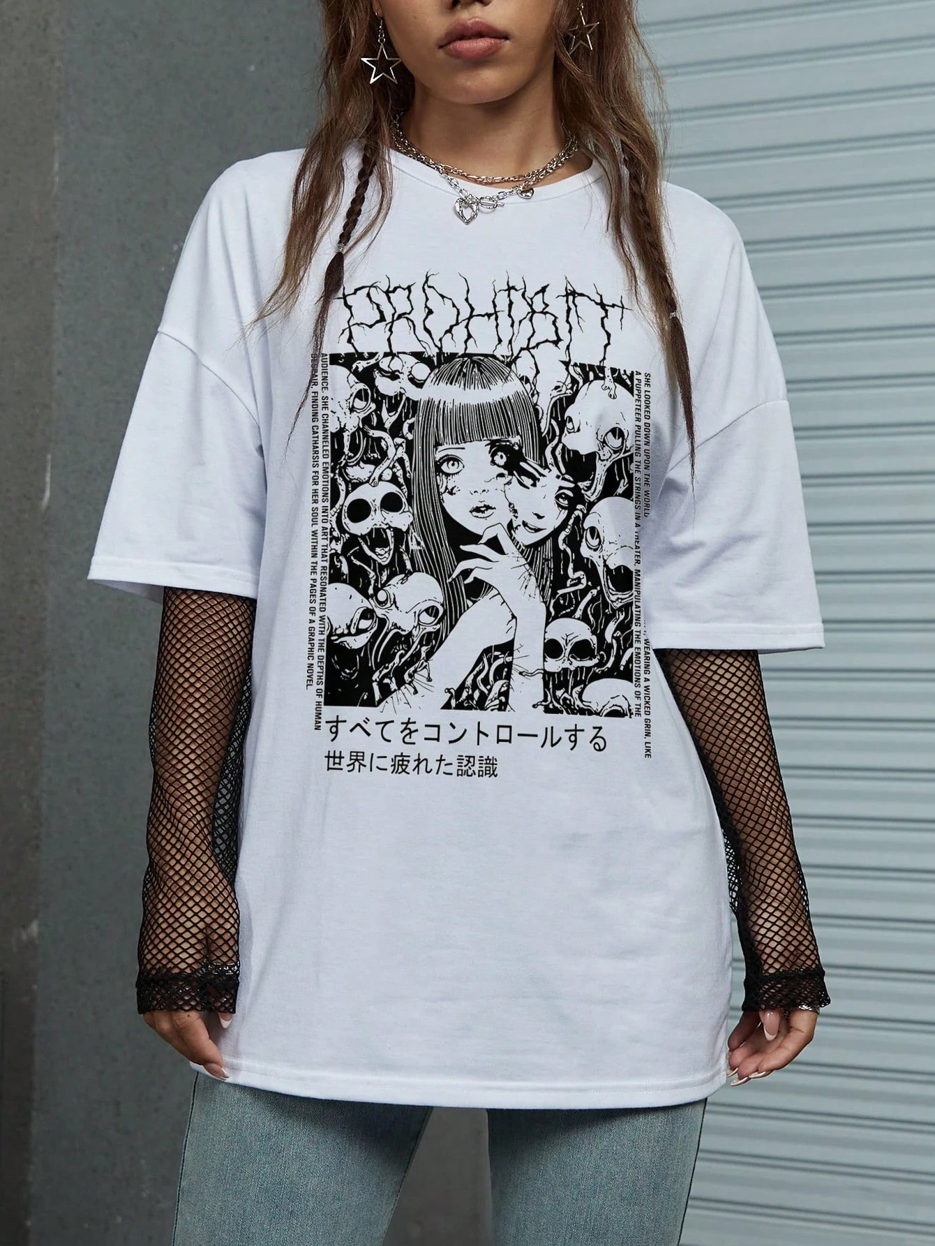 Grunge Punk Camiseta de hombros caídos con estampado de figura y slogan