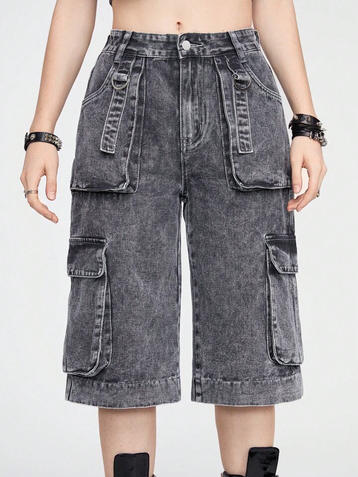 Grunge Punk Jeans de carga con bolsillos con solapa en el lateral