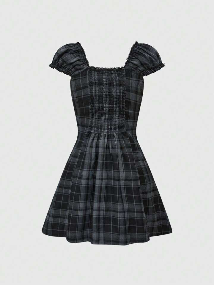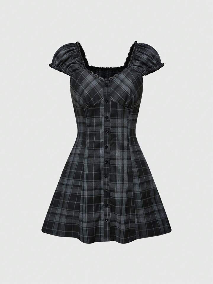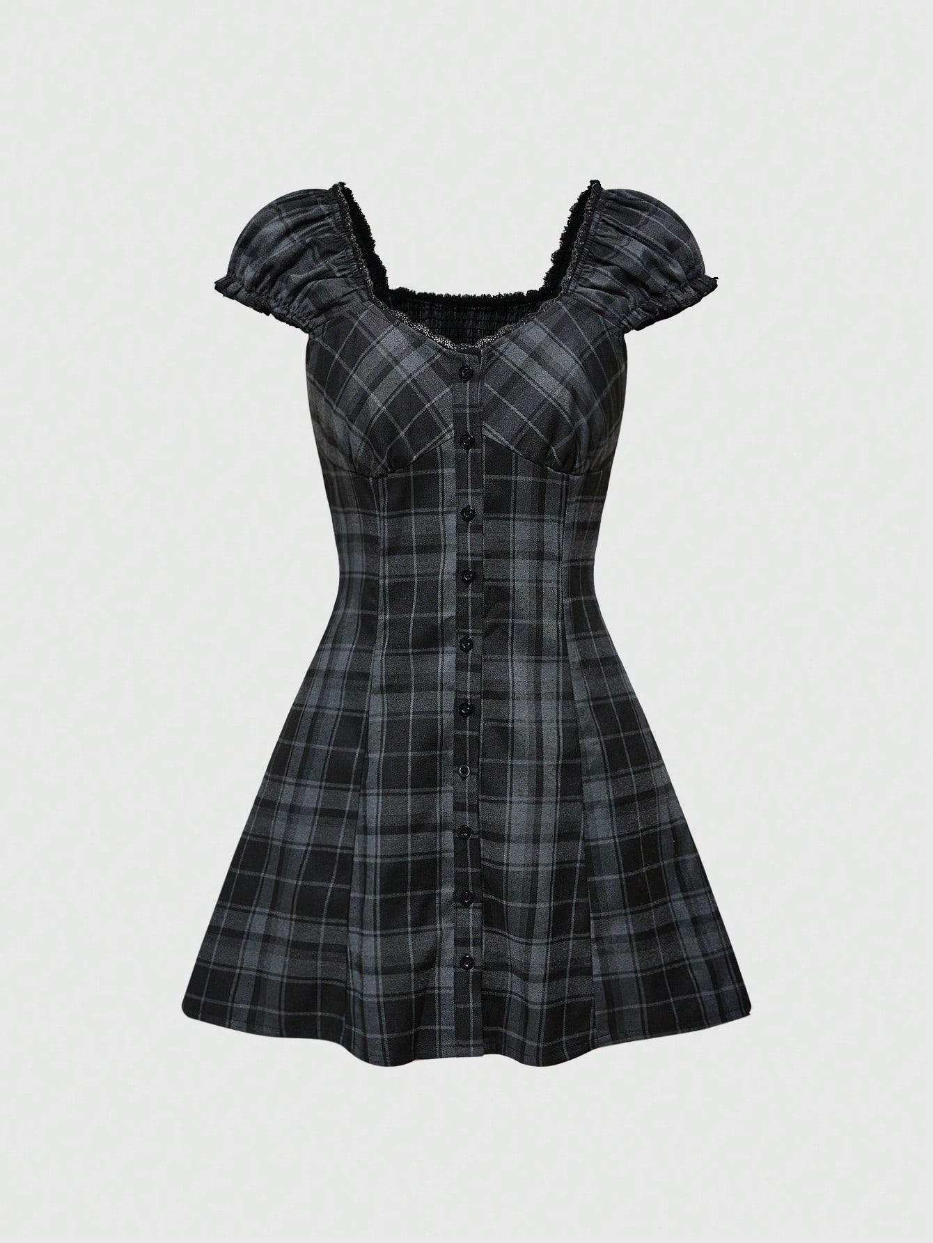 Grunge Punk Vestido corto para niñas con mangas abullonadas, cintura ajustada, volantes con encaje y estampado a cuadros