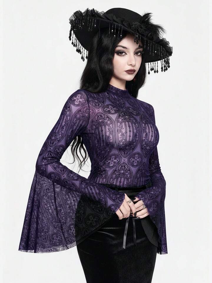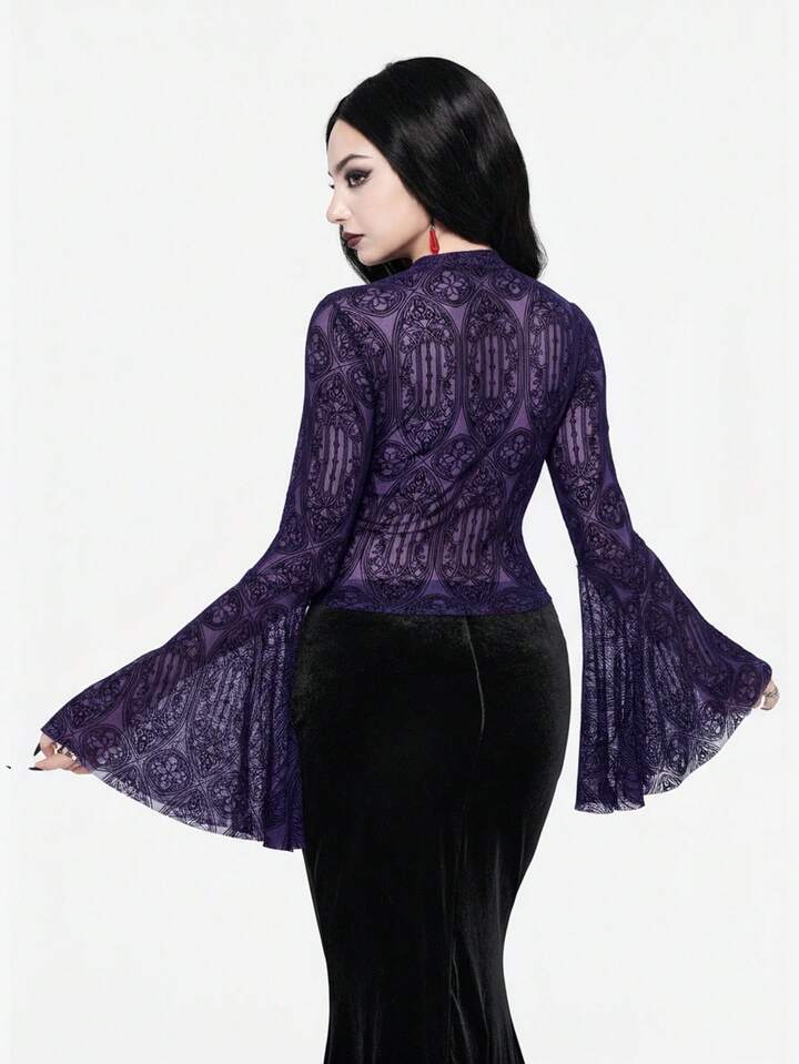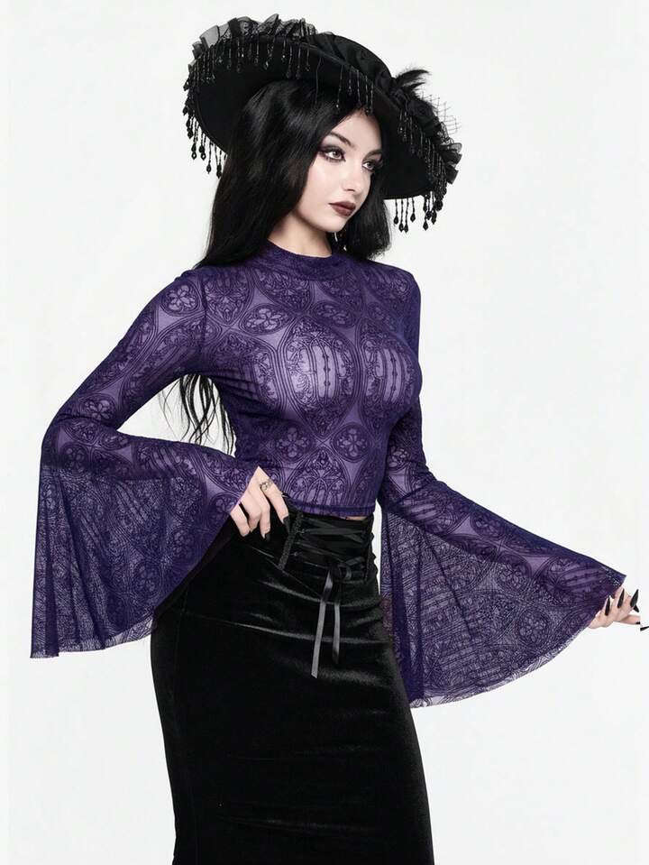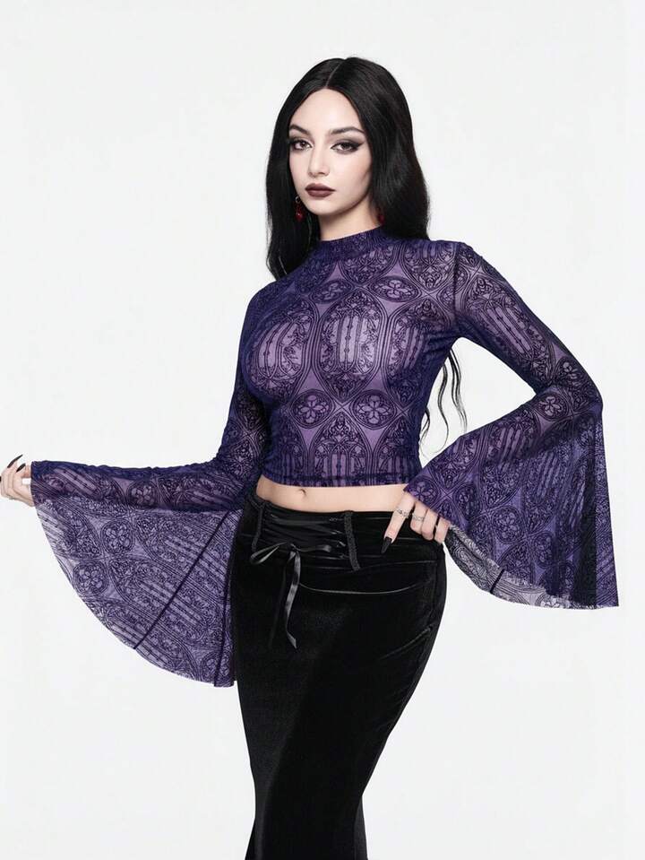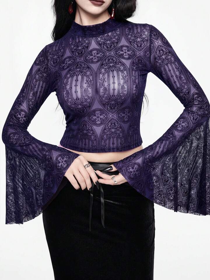 Grunge Punk Blusa transparente con mangas acampanadas y estilo gótico oscuro, adecuada para Halloween