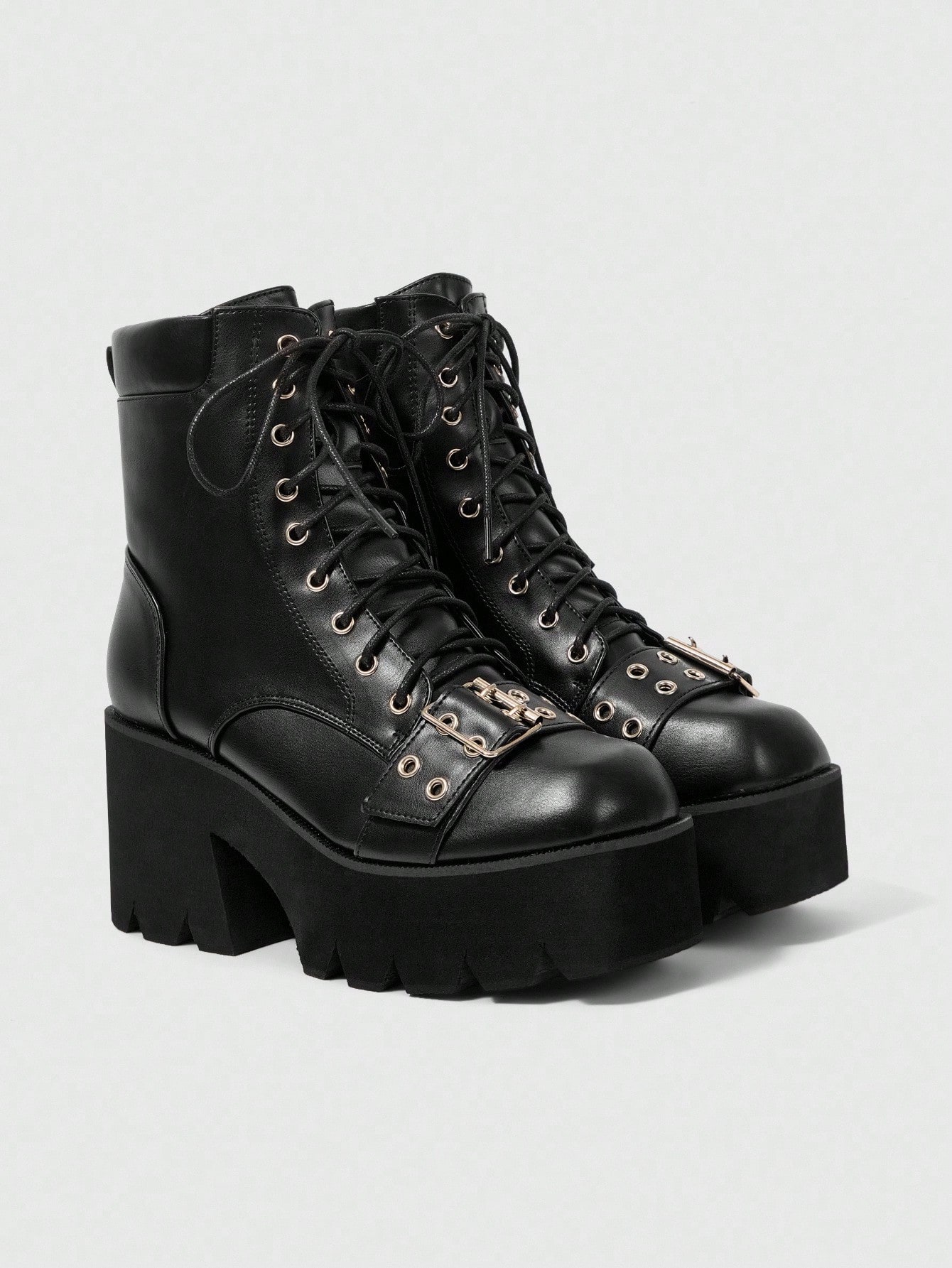 Grunge Punk Botas góticas de puntera cuadrada y tacón grueso, botas de tacón alto de piel de PU negras adecuadas para fiesta, uso diario, vestido de noche, aumento de altura y alargamiento de piernas, Halloween
