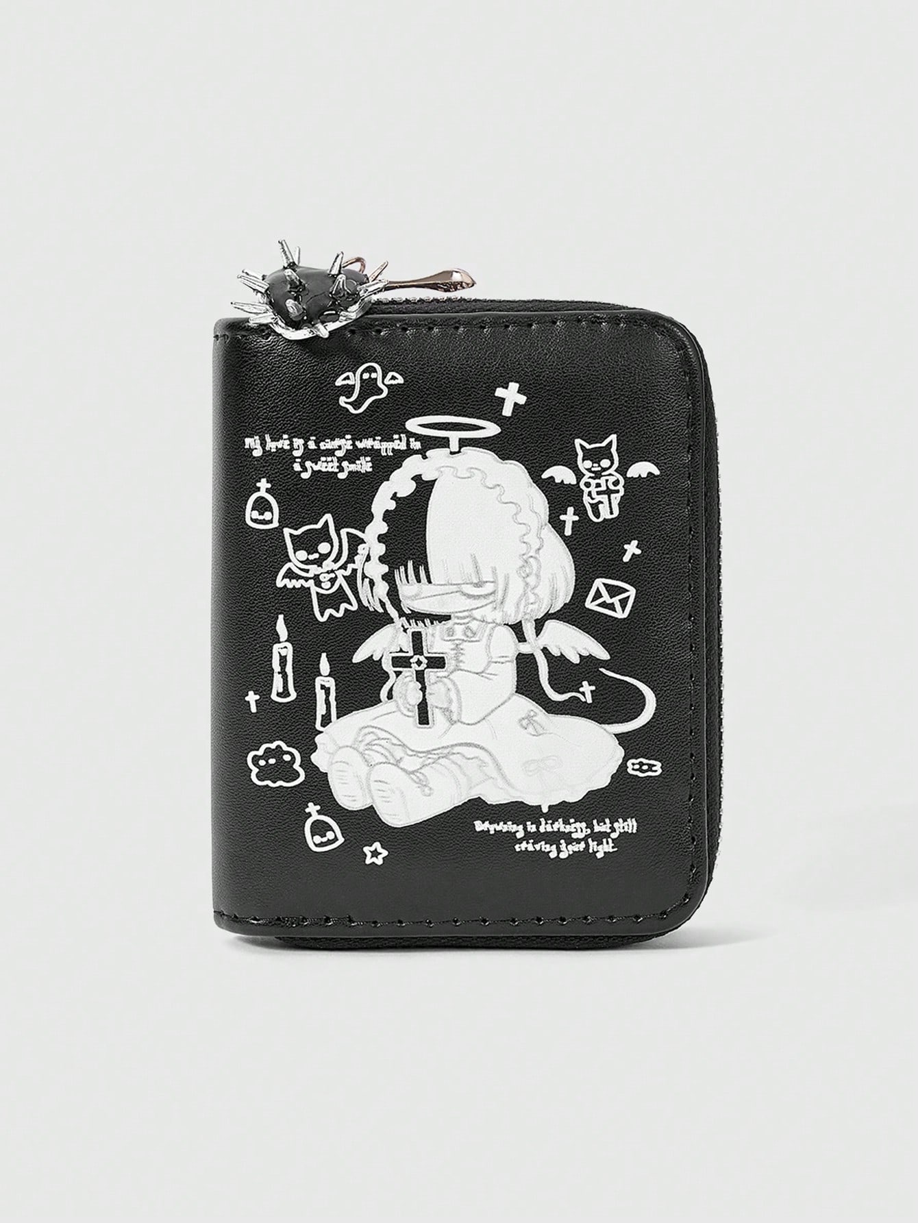 Grunge Punk Cartera/Portacartas multifuncional creativa y linda con diseño de gato negro con moño sobre fondo gris