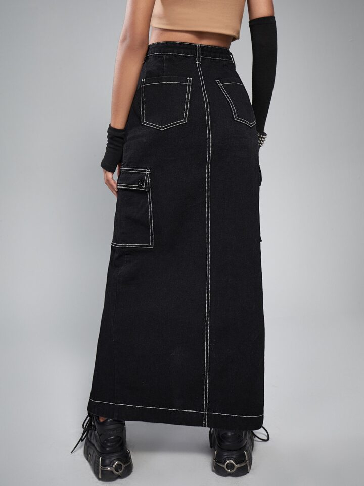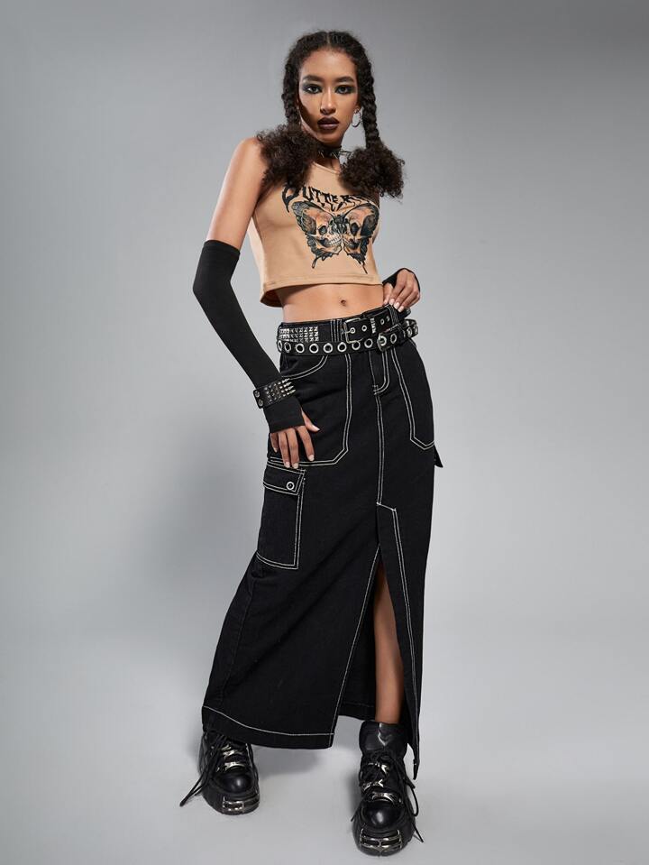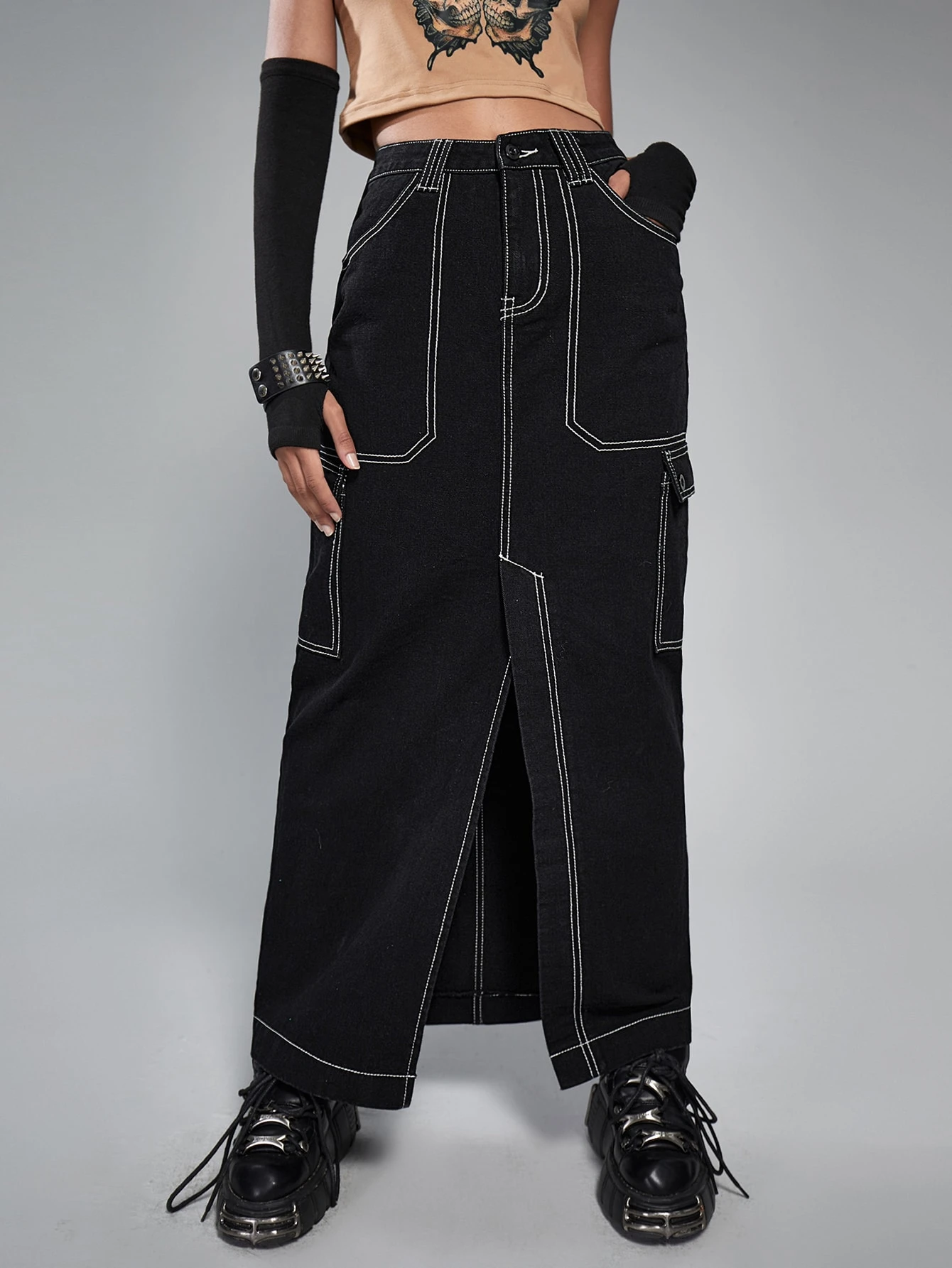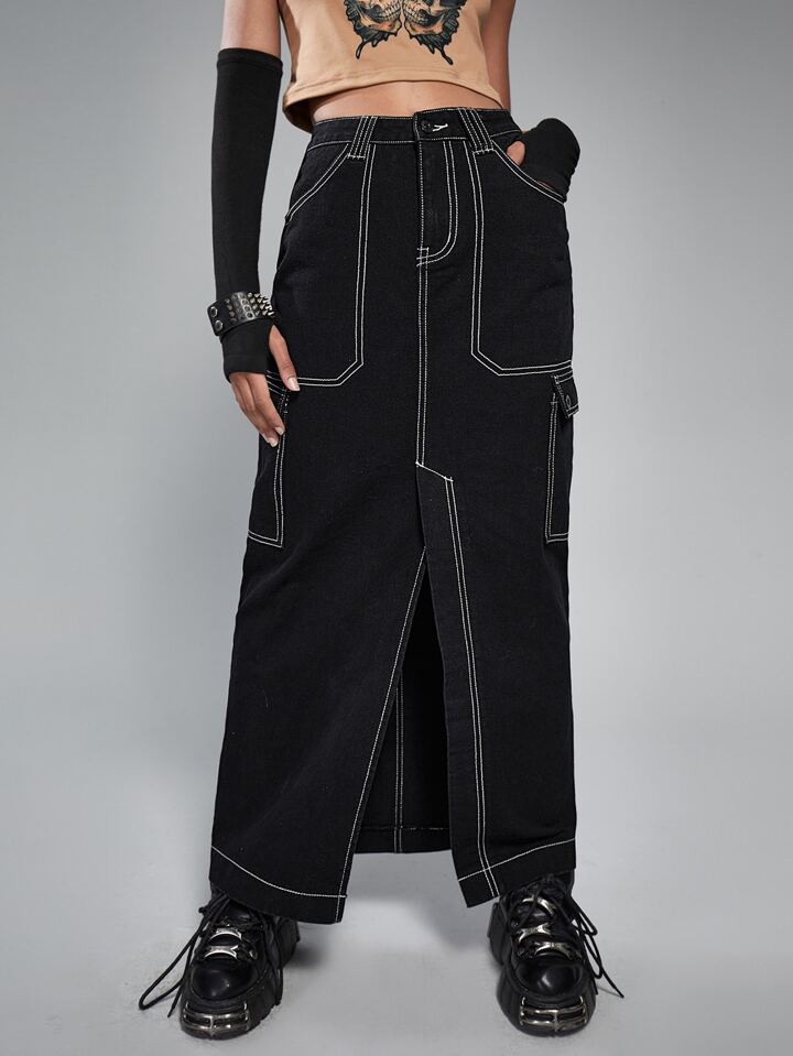 Grunge Punk Falda en mezclilla de talle alto con puntada bajo con abertura