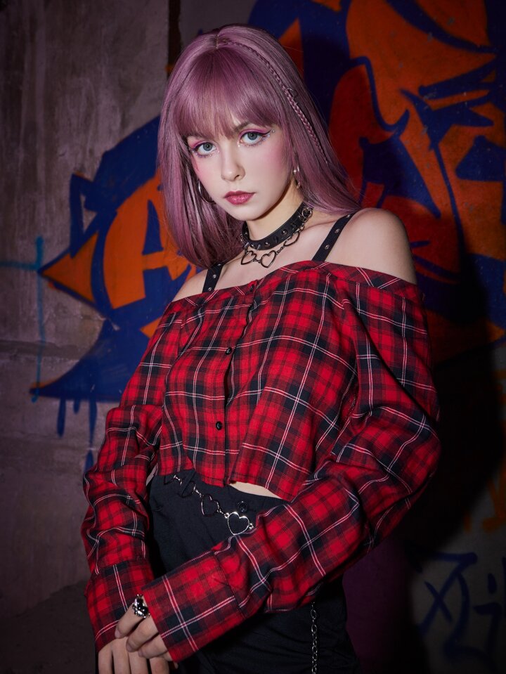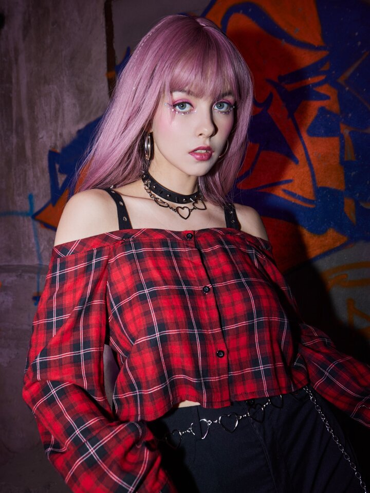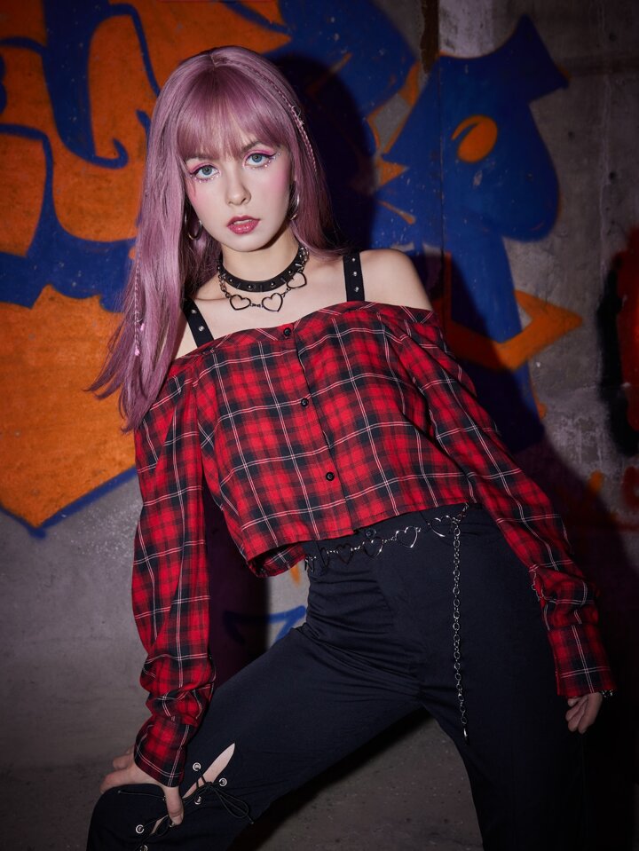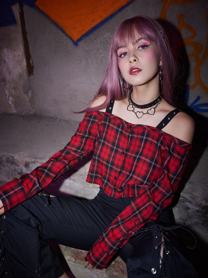 Grunge Punk Top corto de cuadros con ojal de hombros descubiertos