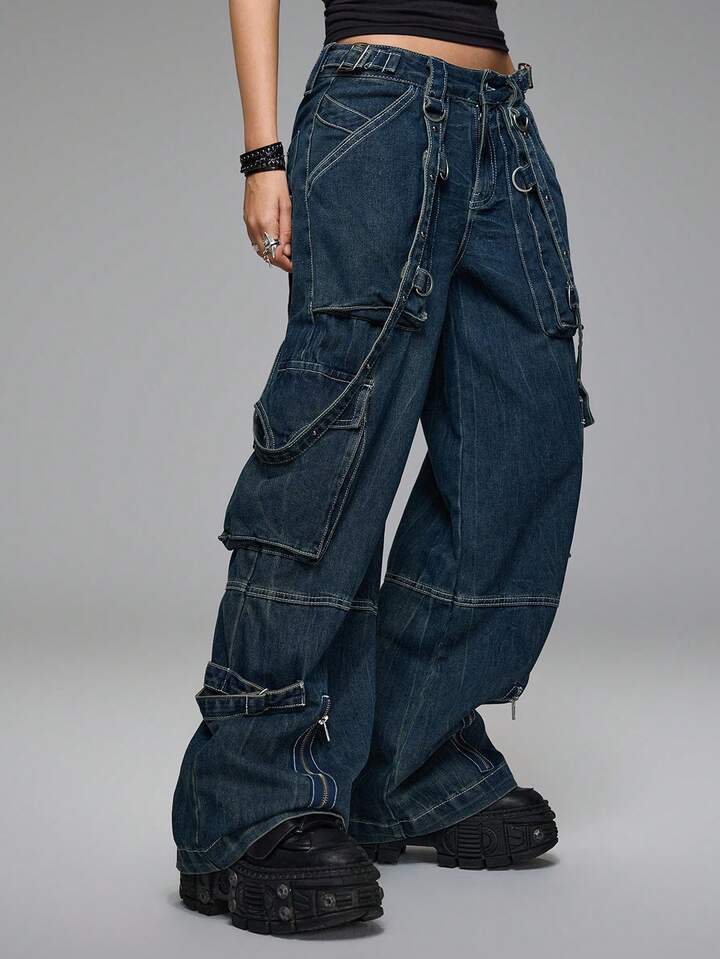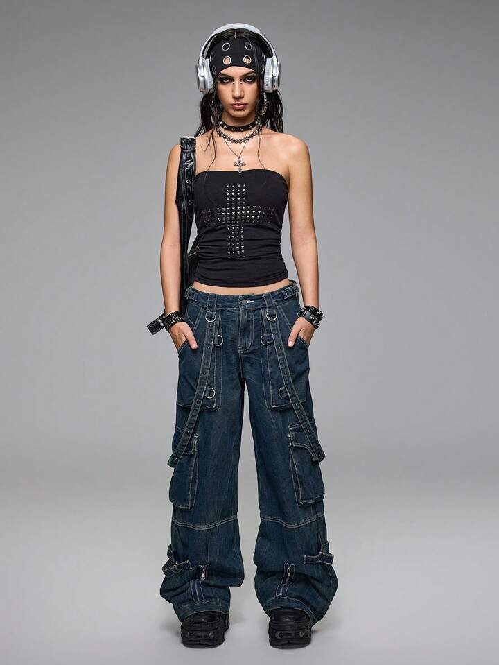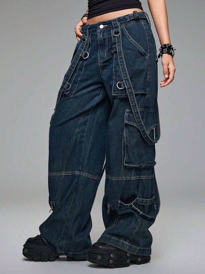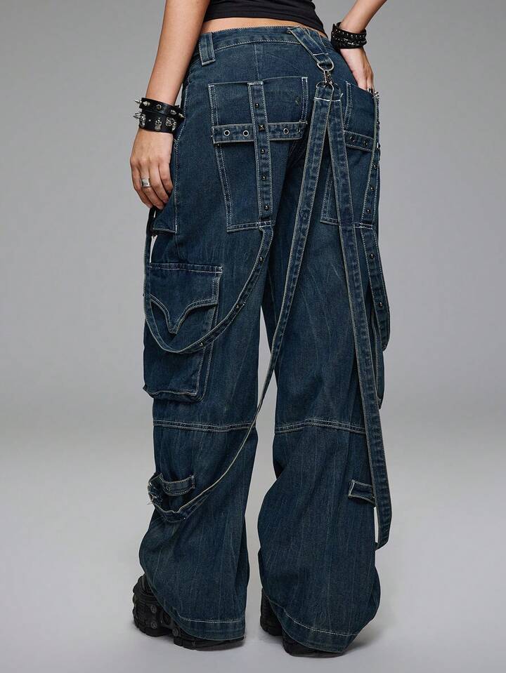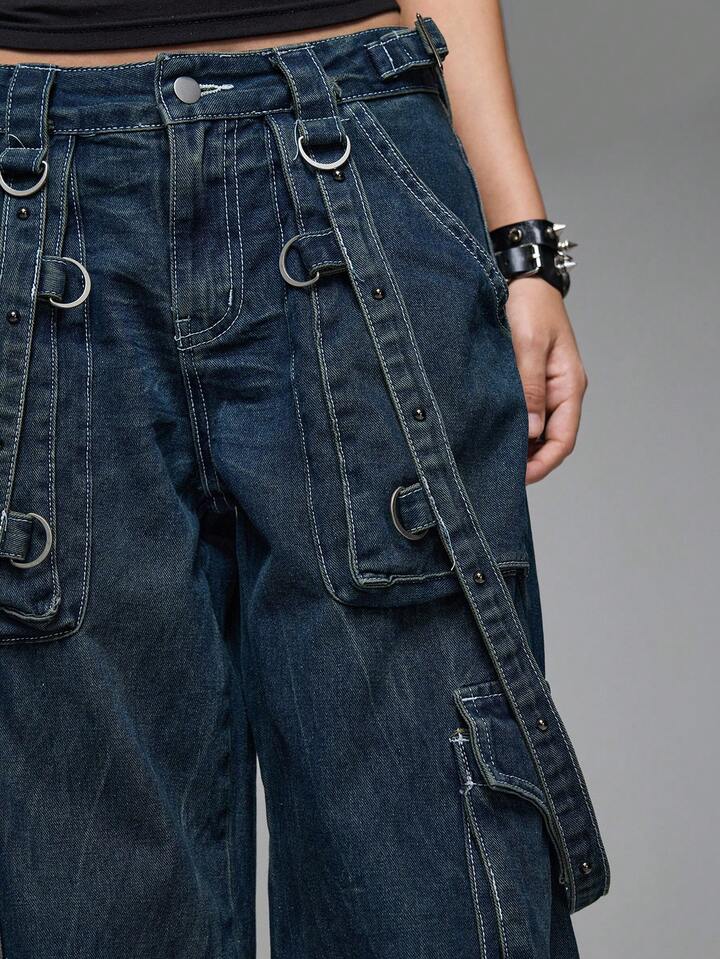 Grunge Punk Jeans anchos de cintura baja con carga, estilo retro punk, con tiras cruzadas y tachuelas
