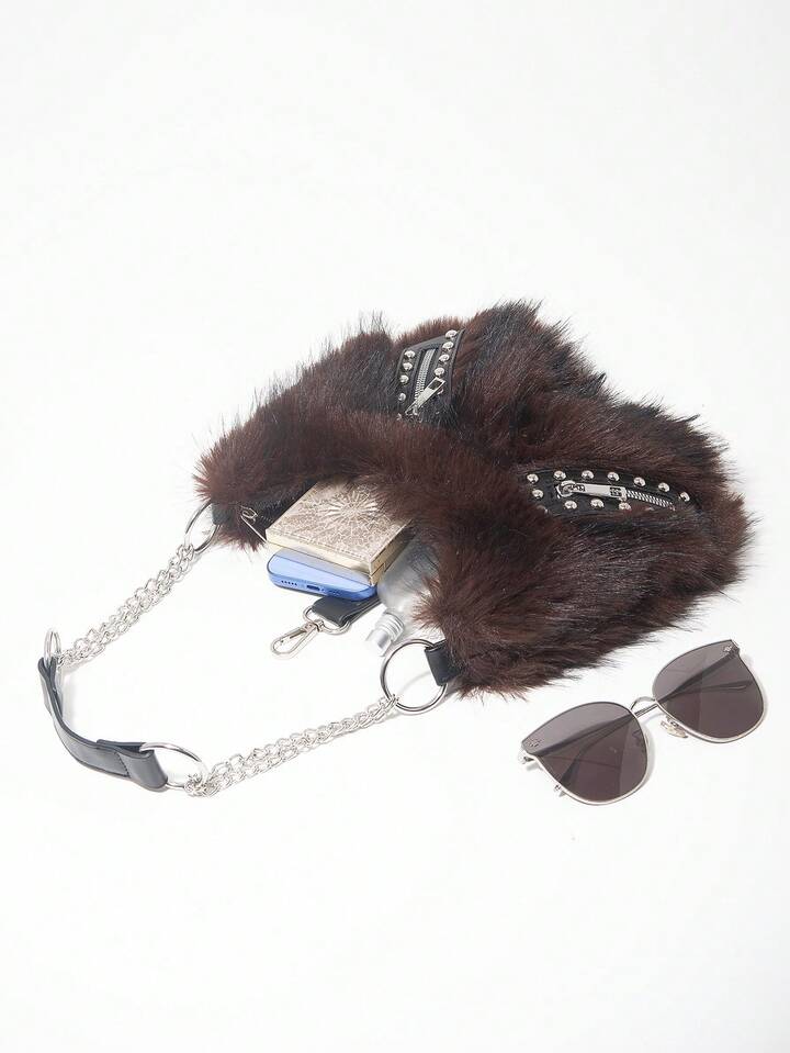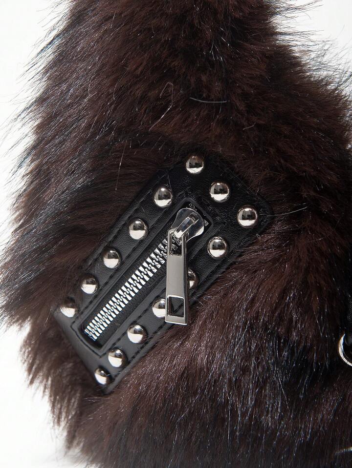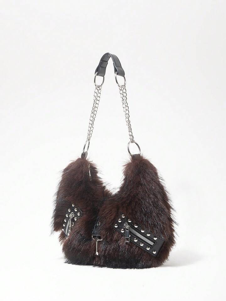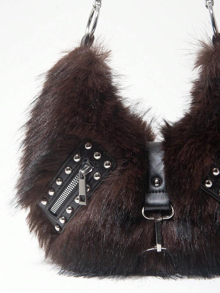 Grunge Punk Bolso de hombro para damas y mujeres, bolso hobo, de piel sintética, peludo, bolso de peluche, con remaches, de moda, personalizado, versátil, para la calle, dulce y fresco para chicas, chicas calientes, punk, Y2K, diario, otoño e invierno (patrón aleatorio)
