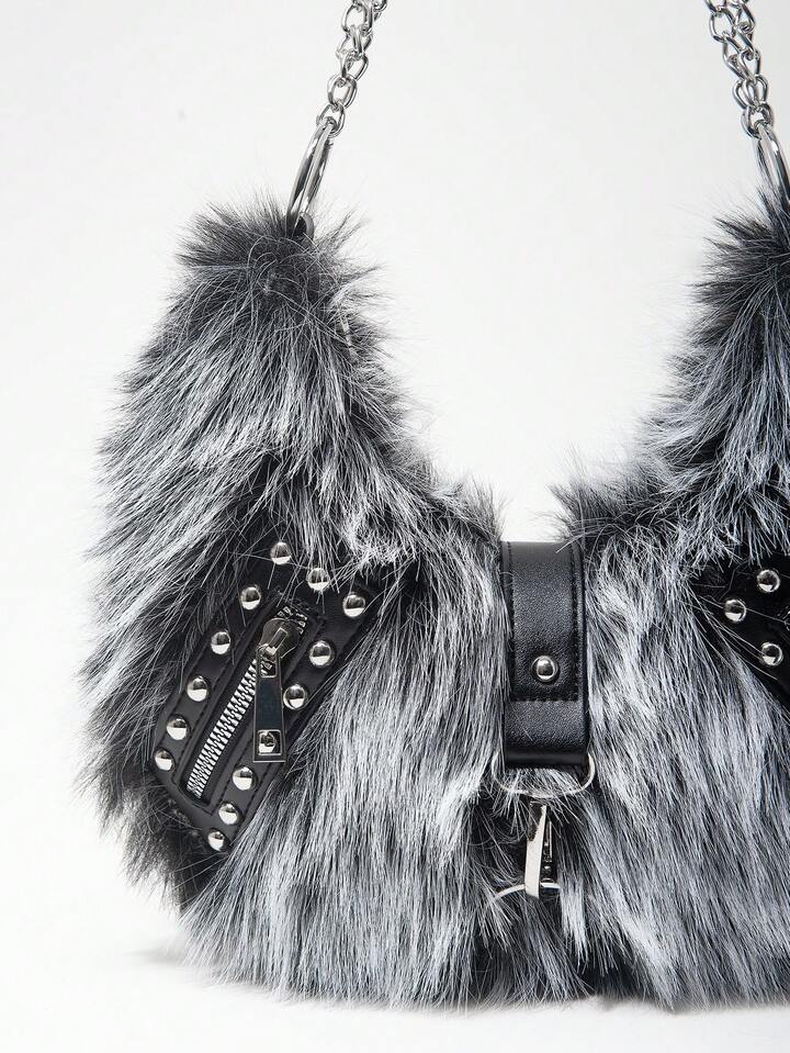 Grunge Punk Bolso de hombro para mujer, bolso hobo, de piel sintética, peludo, bolso de peluche, con remaches, de moda, personalizado, versátil, para la calle, dulce y fresco para chicas, chicas calientes, punk, Y2K, diario, otoño e invierno (patrón aleatorio)