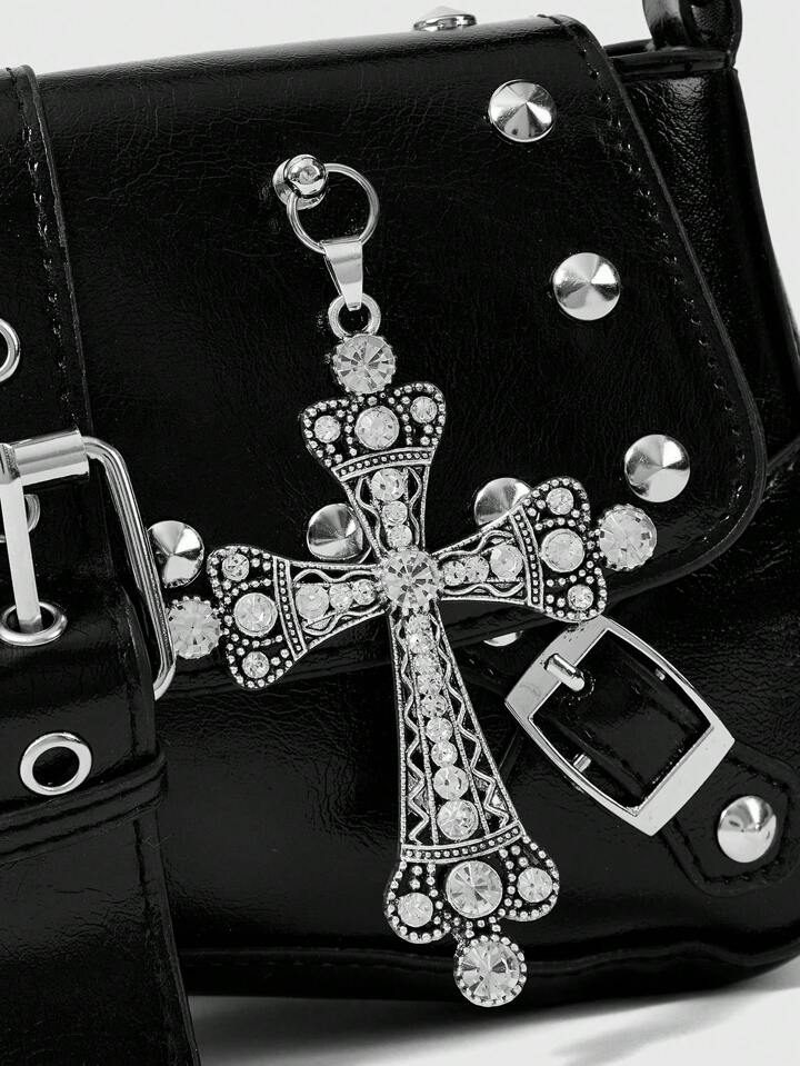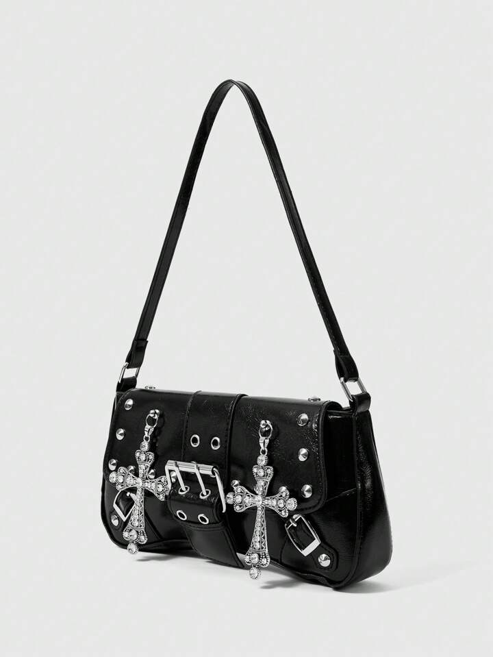 Grunge Punk Bolso de hombro para mujer, estilo gótico oscuro, punk, con remaches, cruz de diamante, negro, de moda, personalizado, sencillo, versátil, de calle, dulce y genial para chicas, chicas calientes, Y2k, remaches
