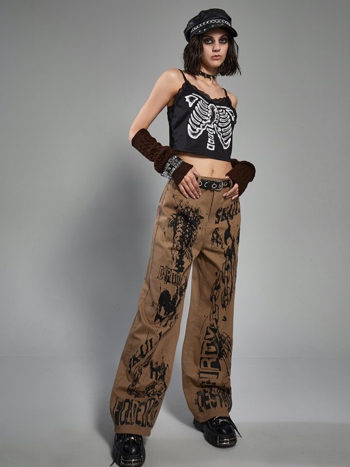 Grunge Punk Jeans con letra con estampado de esqueleto sin cinturón