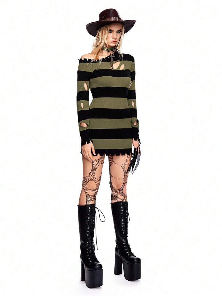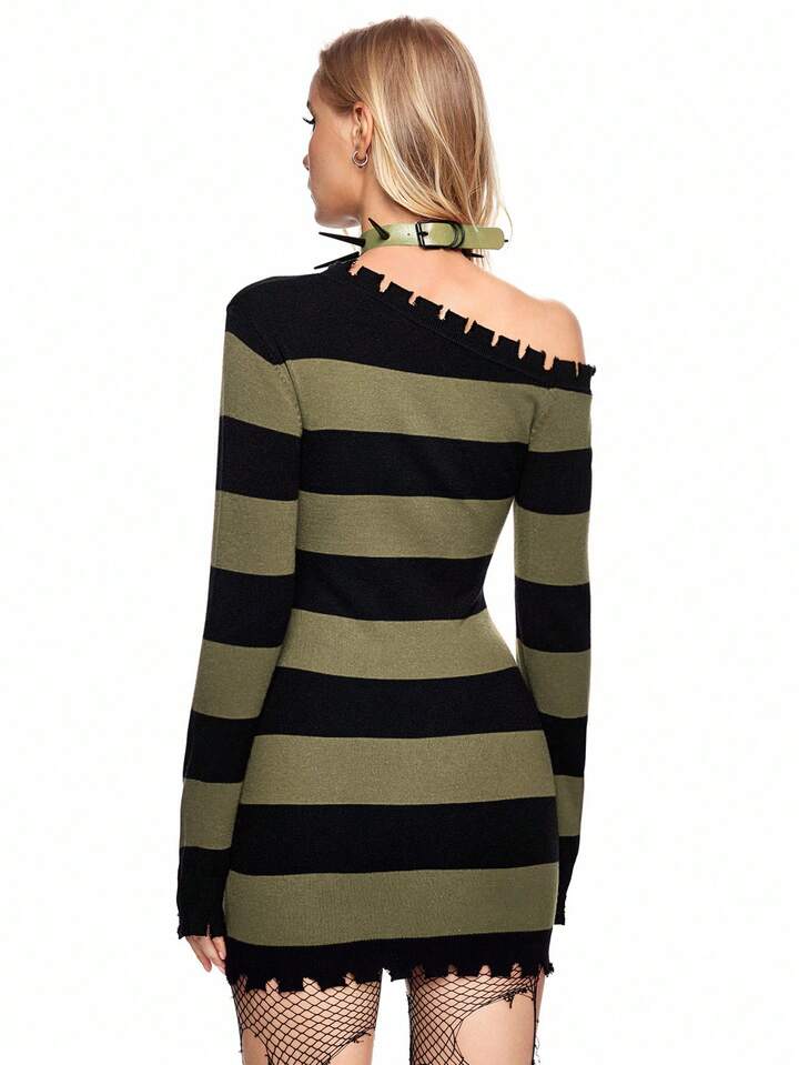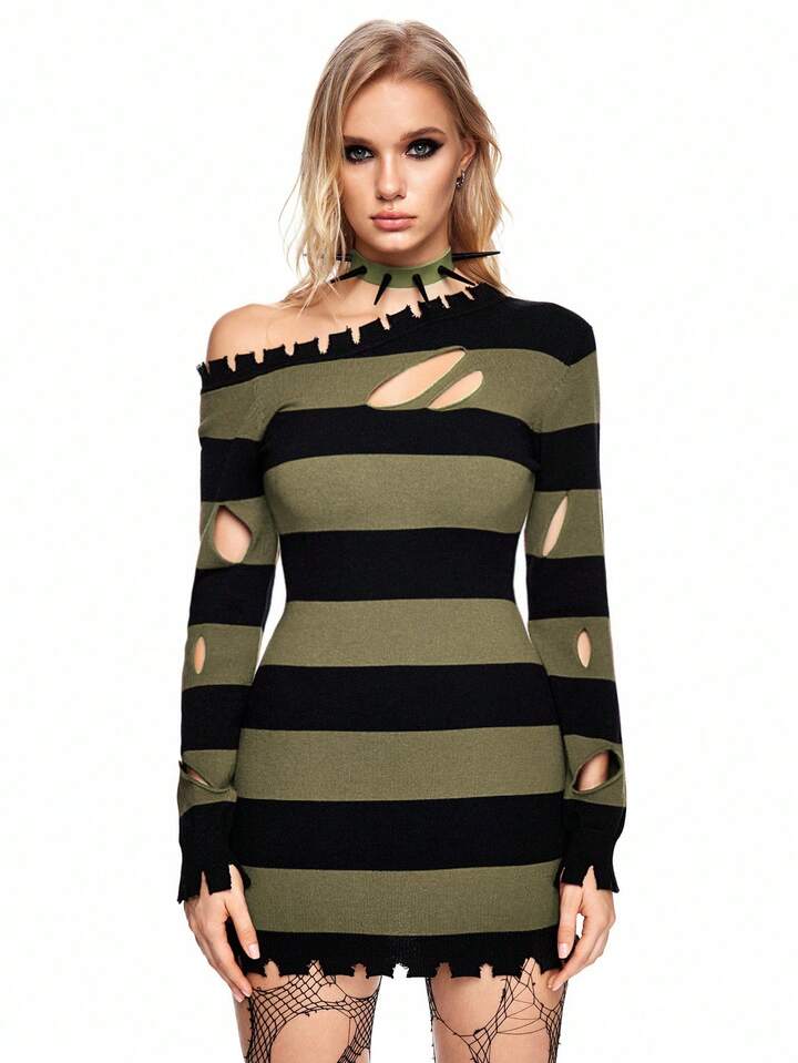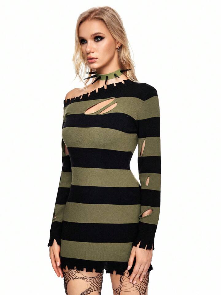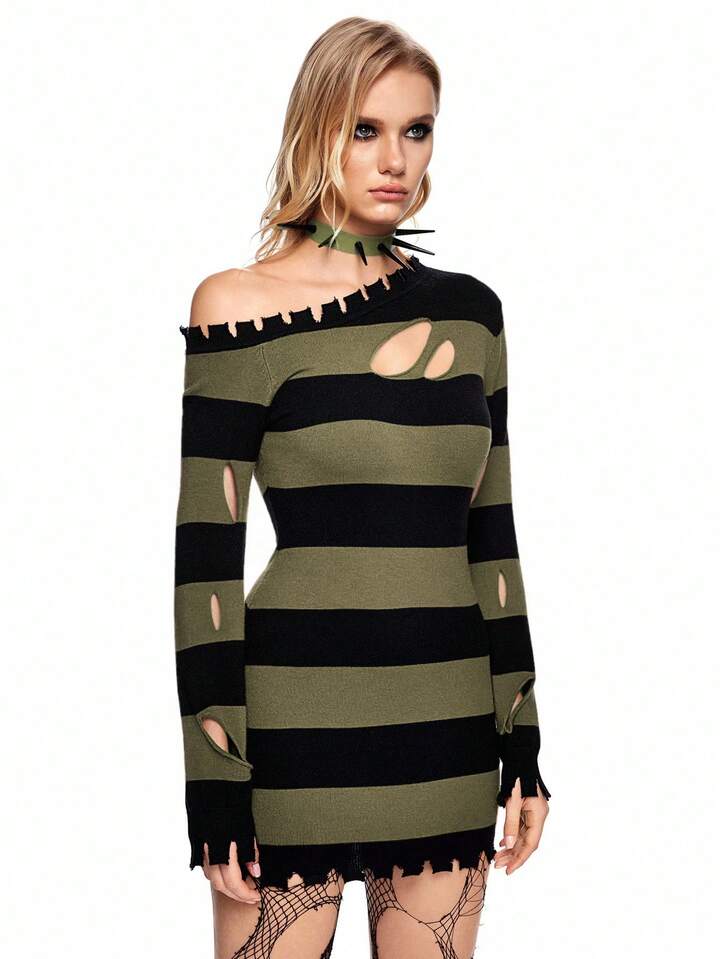 Grunge Punk Suéter de cuello alto a rayas rojas y negras con roturas