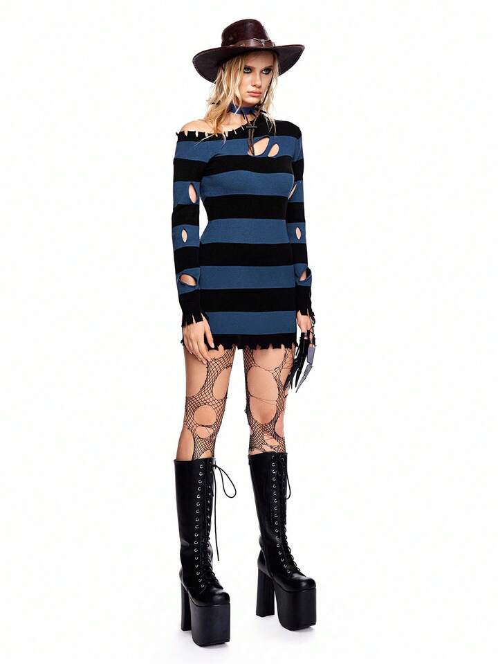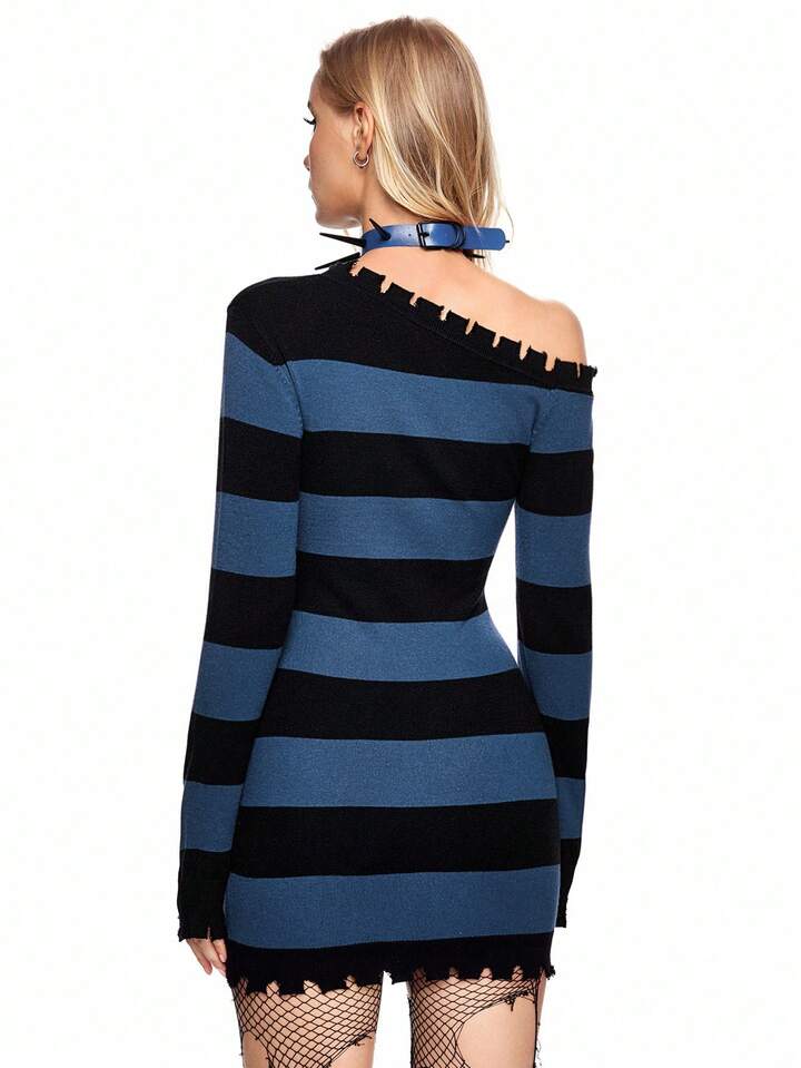 Grunge Punk Suéter de cuello alto a rayas rojas y negras con roturas