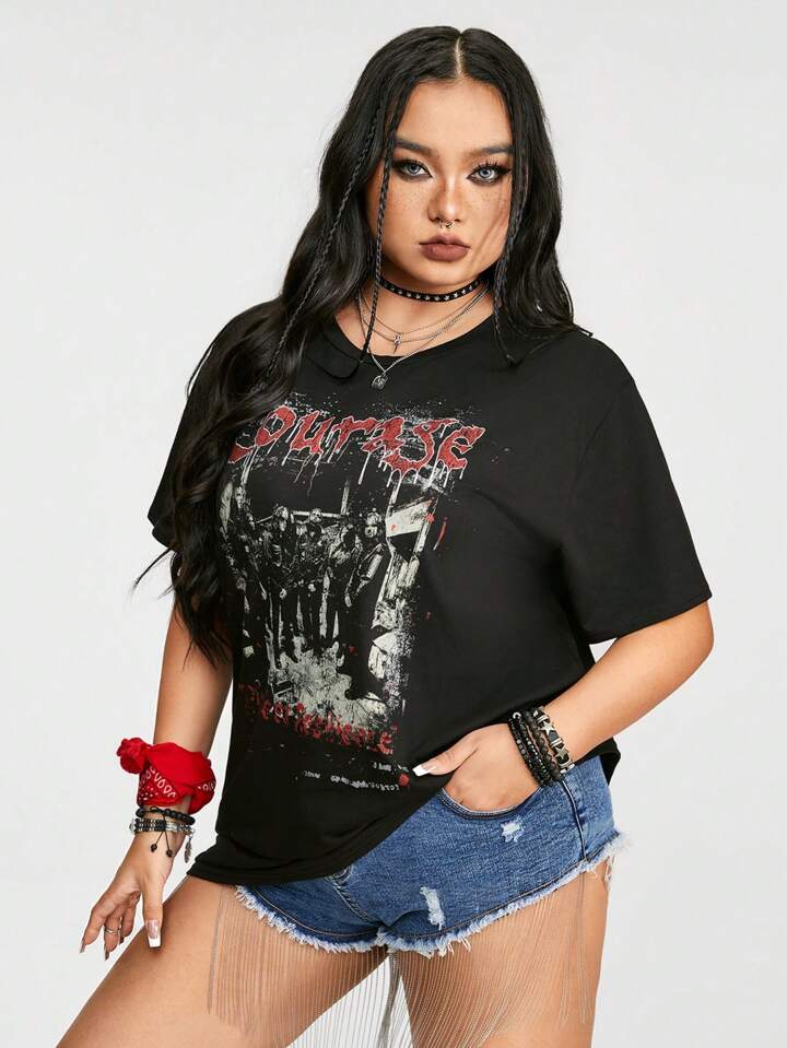 Grunge Punk Camiseta Para Mujer De Talla Grande, Negra, Con Letra De Banda Y Estampado Antiguo Y Desgastado De Retrato Estilo Callejero. Adecuado Para Verano.