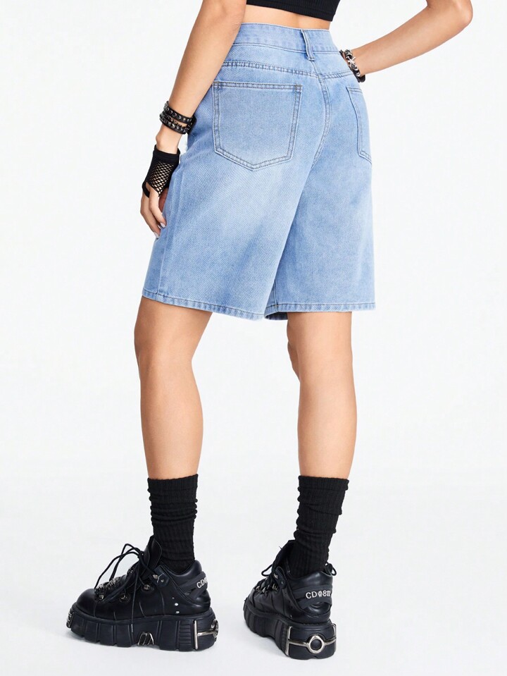 Grunge Punk Shorts de mezclilla sueltos rectos de talle medio para mujer con bordado de estrella, diseño de graffiti, rasgaduras y varios bolsillos