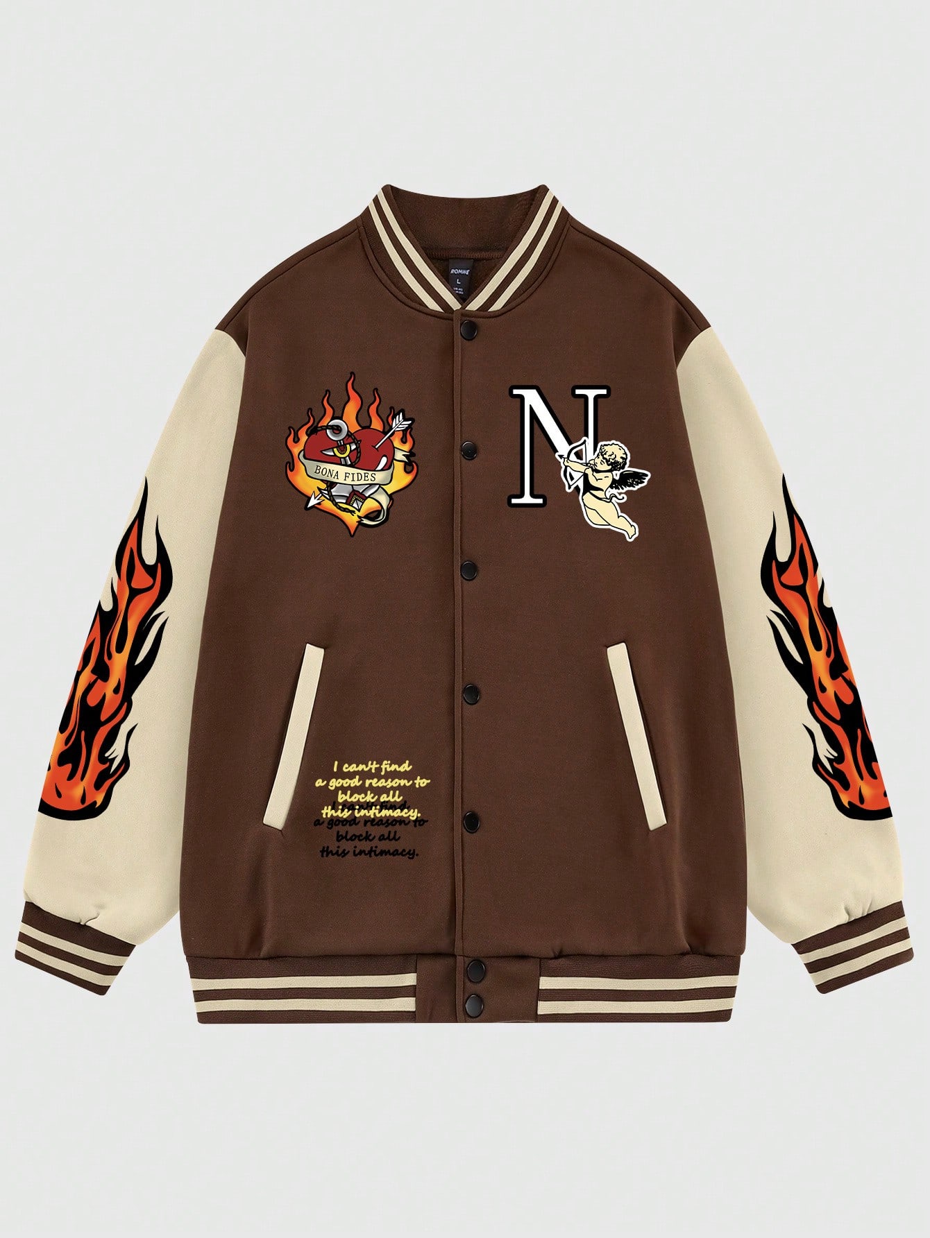 Grunge Punk Chaquetón Universitario De Los Hombres Con Bolsillos De Bisel, Gráficos De Fuego Y Letras Con Recorte A Rayas