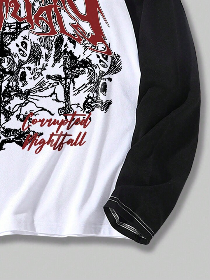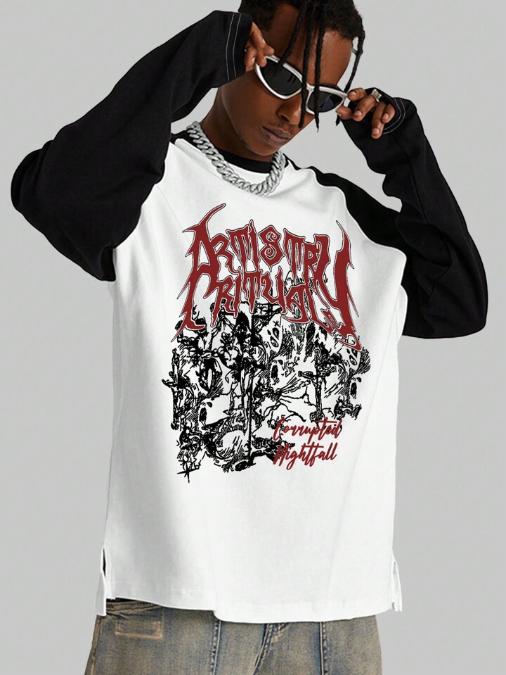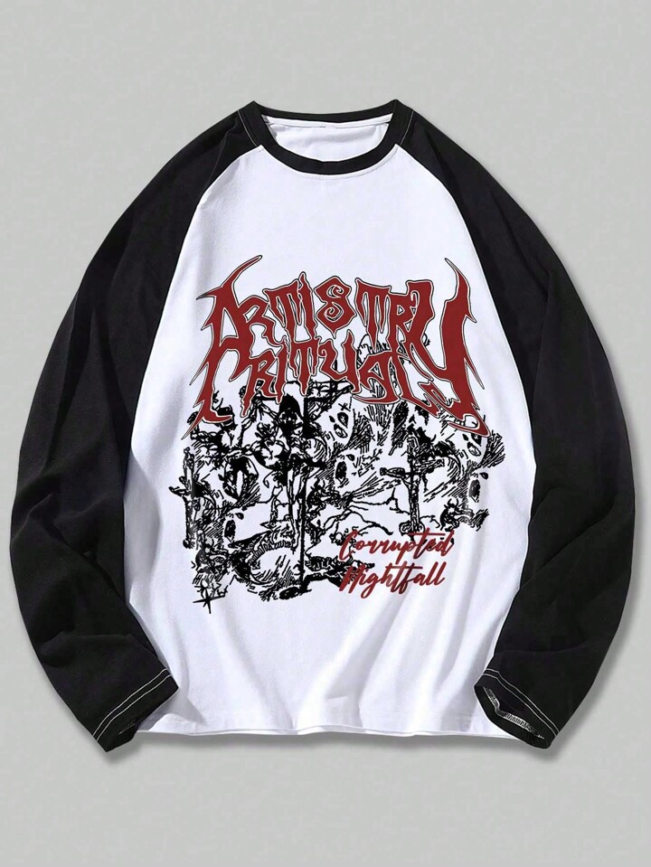 Grunge Punk Camiseta de manga raglán con estampado de letras para hombres, estilo escolar, para otoño, estilo de los 2000