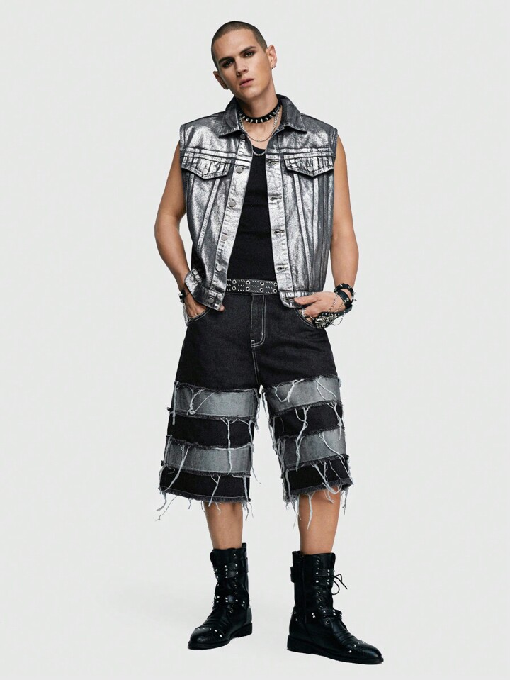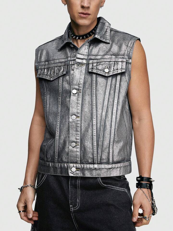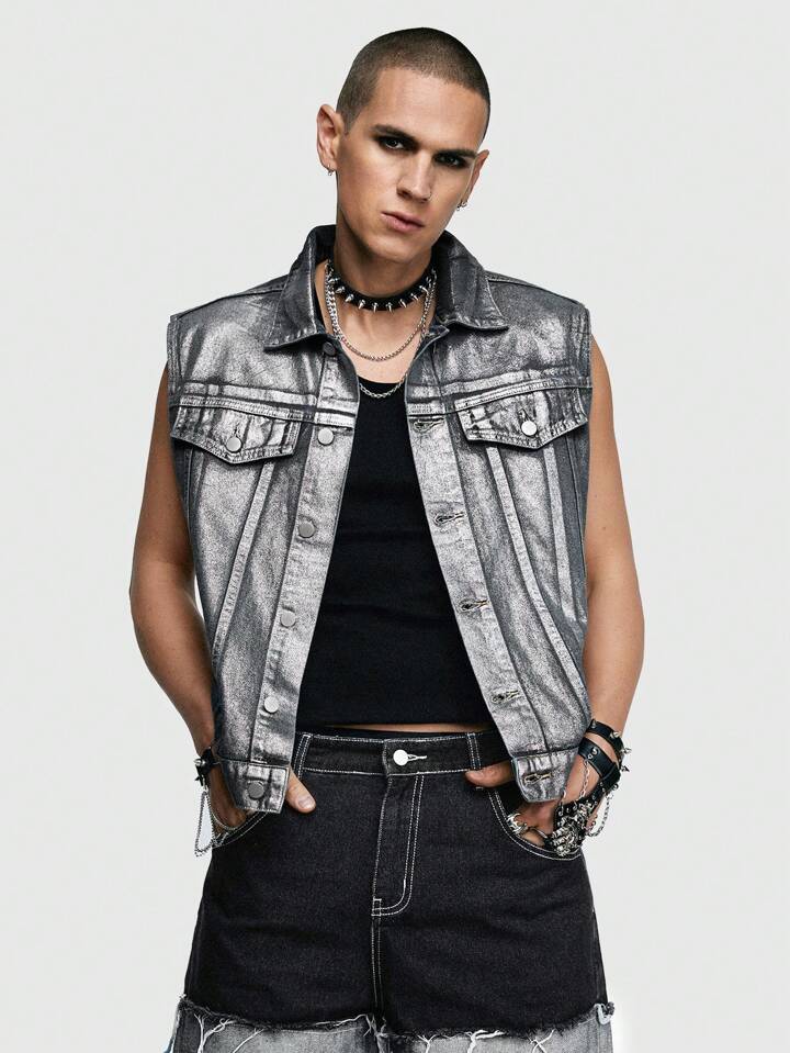 Grunge Punk Chaleco De Vaquero Reflectante Plateado Para Hombre