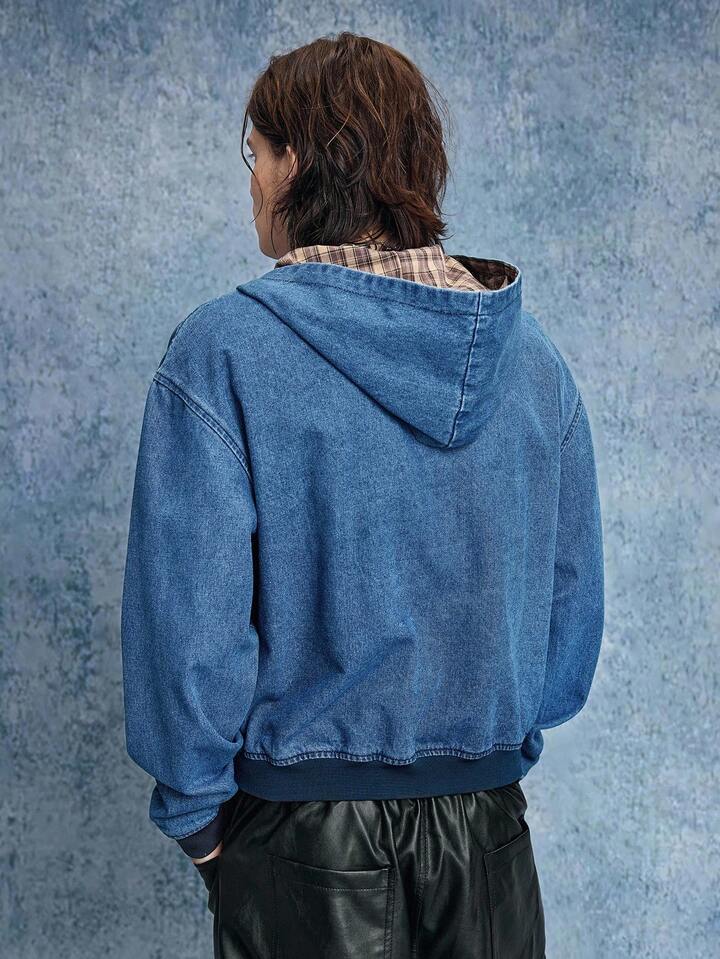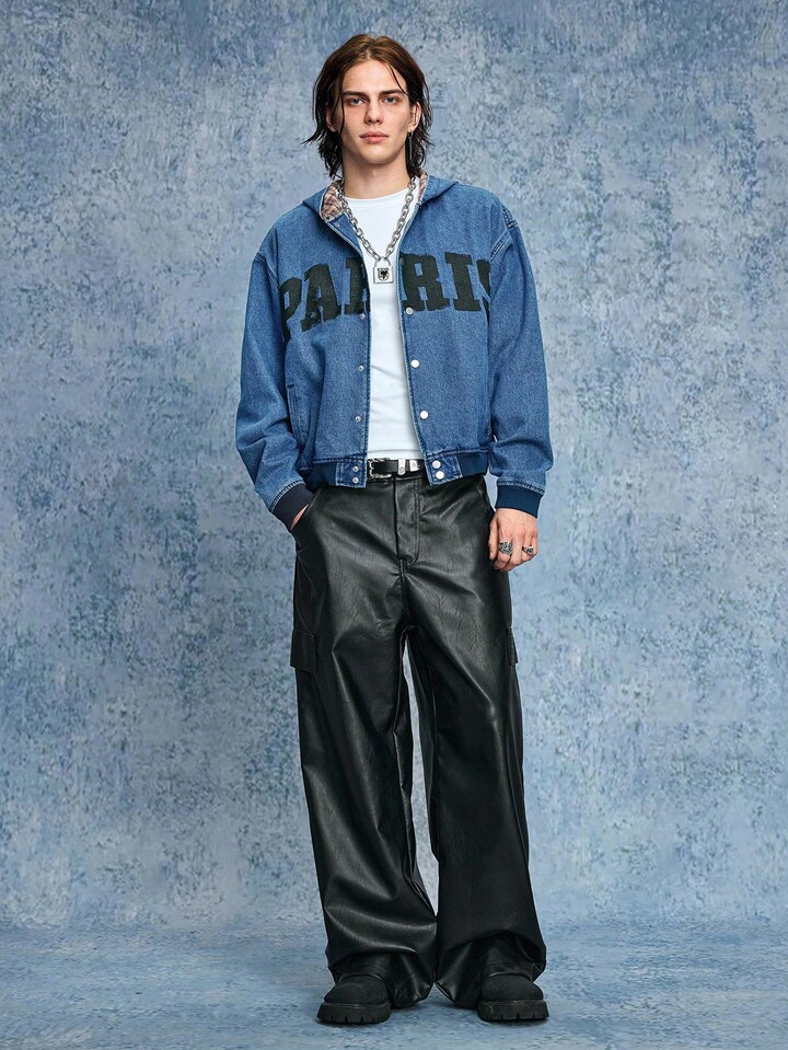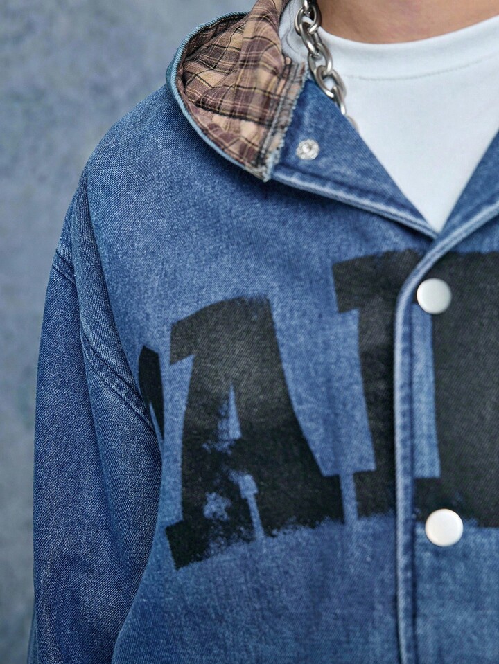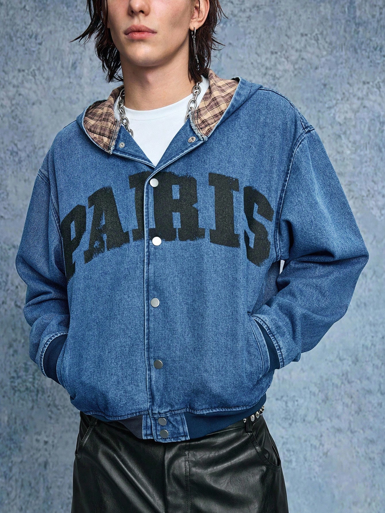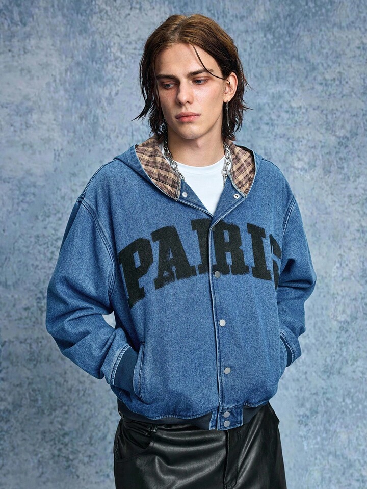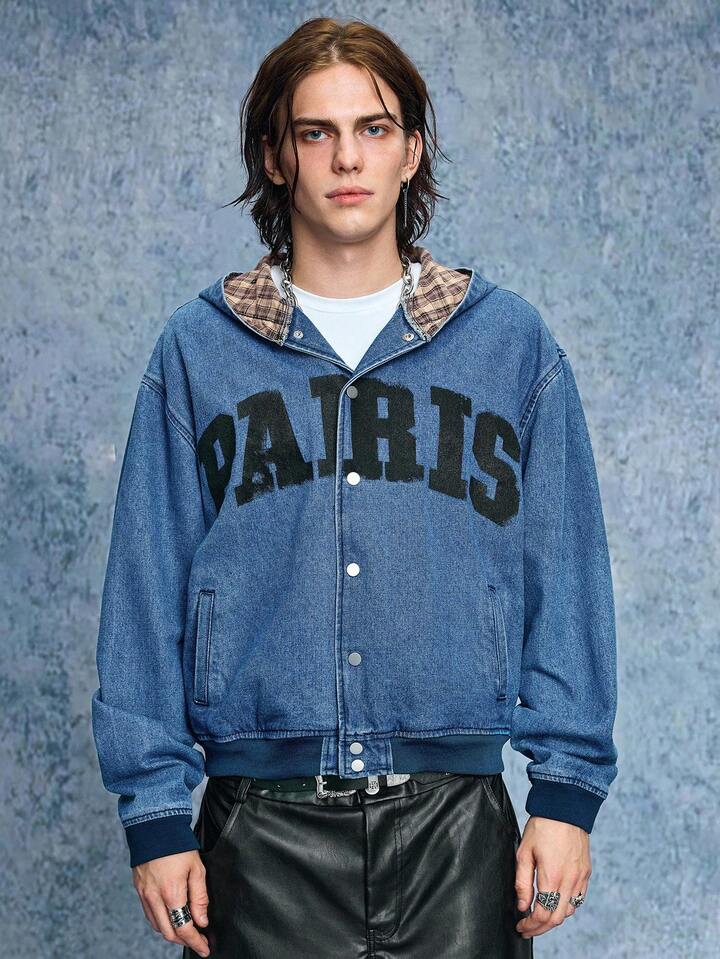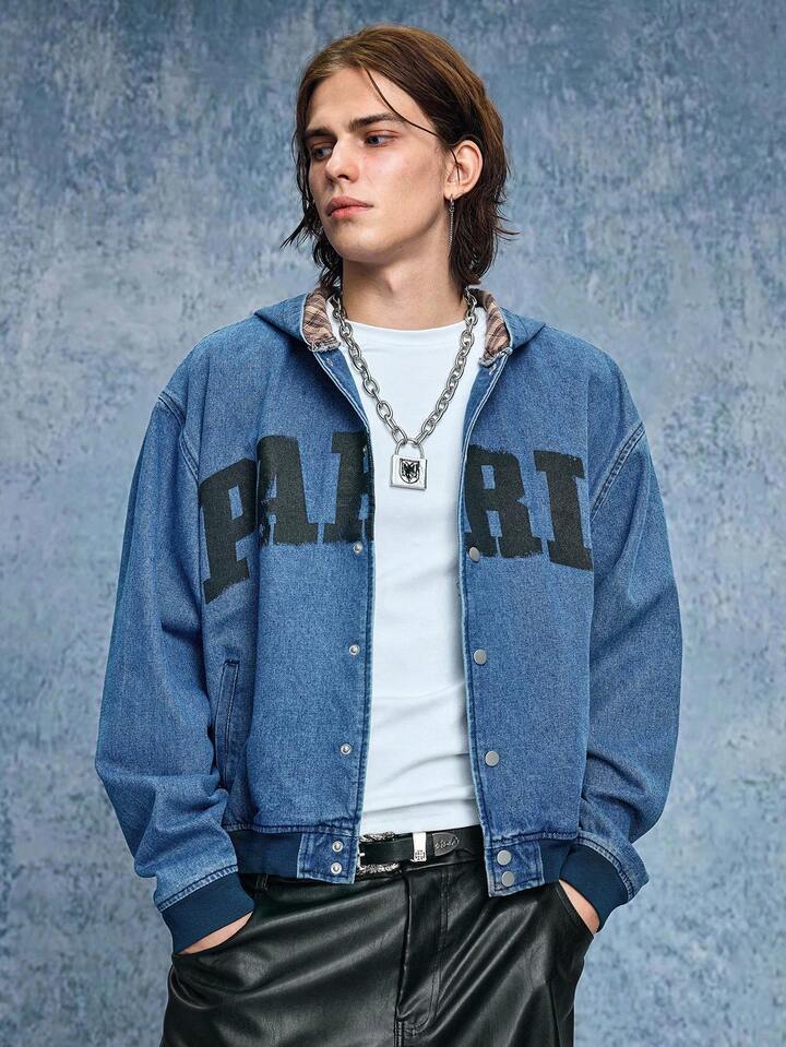 Grunge Punk Chaqueta de mezclilla con capucha, de manga larga, de un solo pecho, con bolsillo y gráfico de letras, para hombre, de otoño