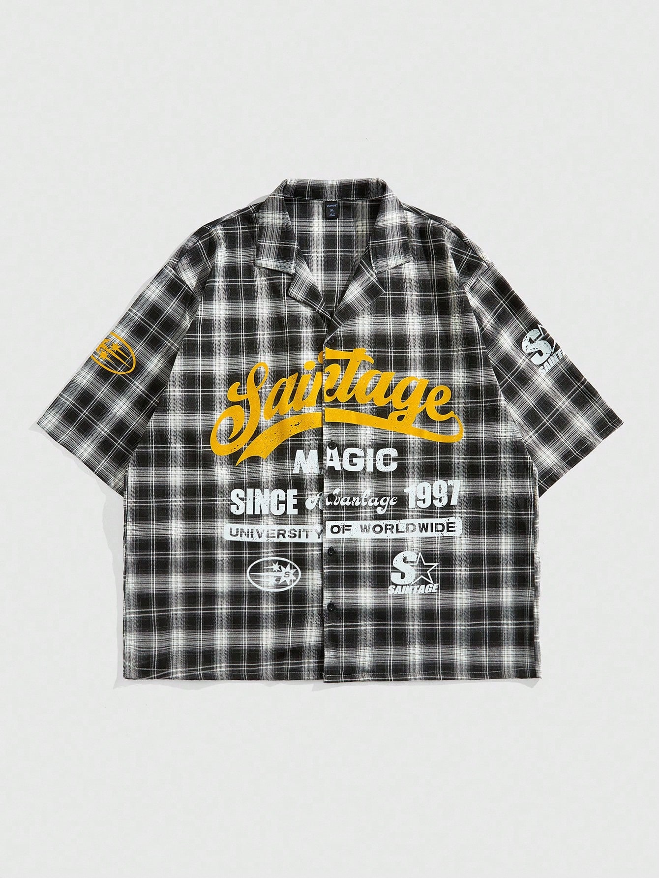 Grunge Punk Camisa casual de hombre con estampado de letras y cuadros, apta para uso diario en primavera/verano