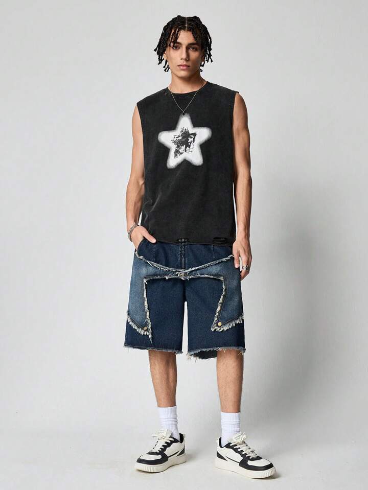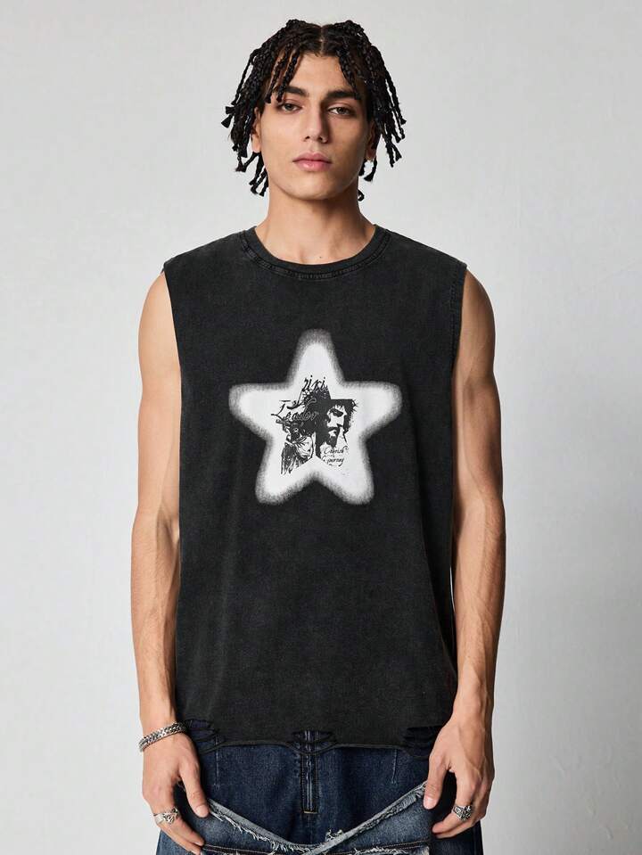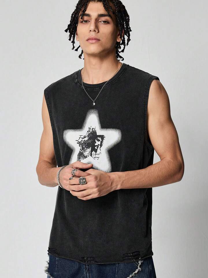 Grunge Punk Camiseta de tirantes casual con estampado de estrellas y efecto desgastado para hombre