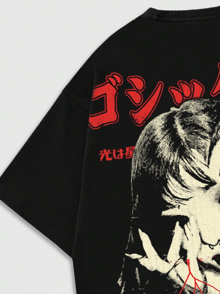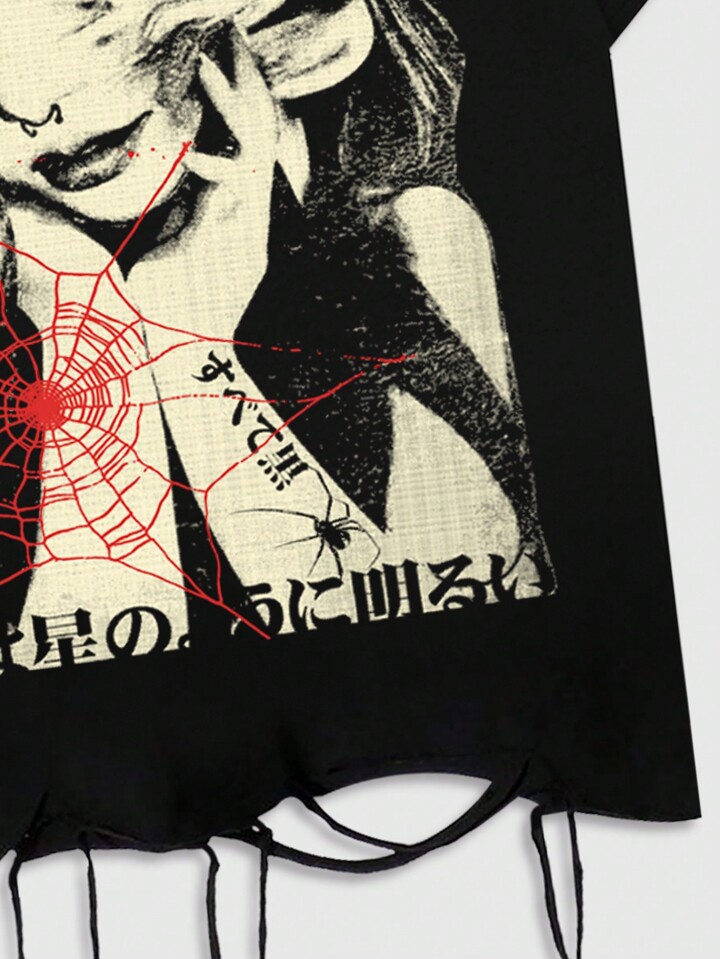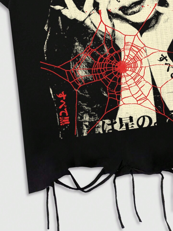 Grunge Punk Camiseta casual de manga corta con cuello redondo para hombre, con gráfico de letra y araña deshilachado