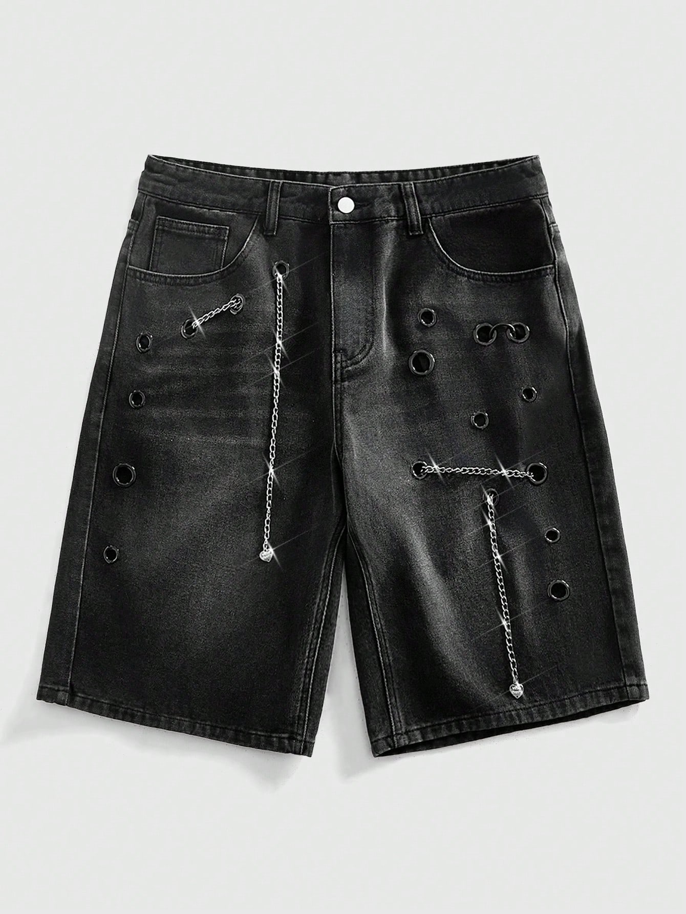 Grunge Punk Pantalones cortos de mezclilla lavados con detalles de cadena con ojetes, de moda casual de verano para hombres para uso diario y trayectos