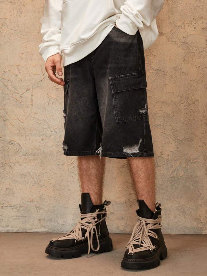 Grunge Punk Pantalones casuales de mezclilla tipo bermuda con bolsillos utilitarios y efecto desgastado para hombres