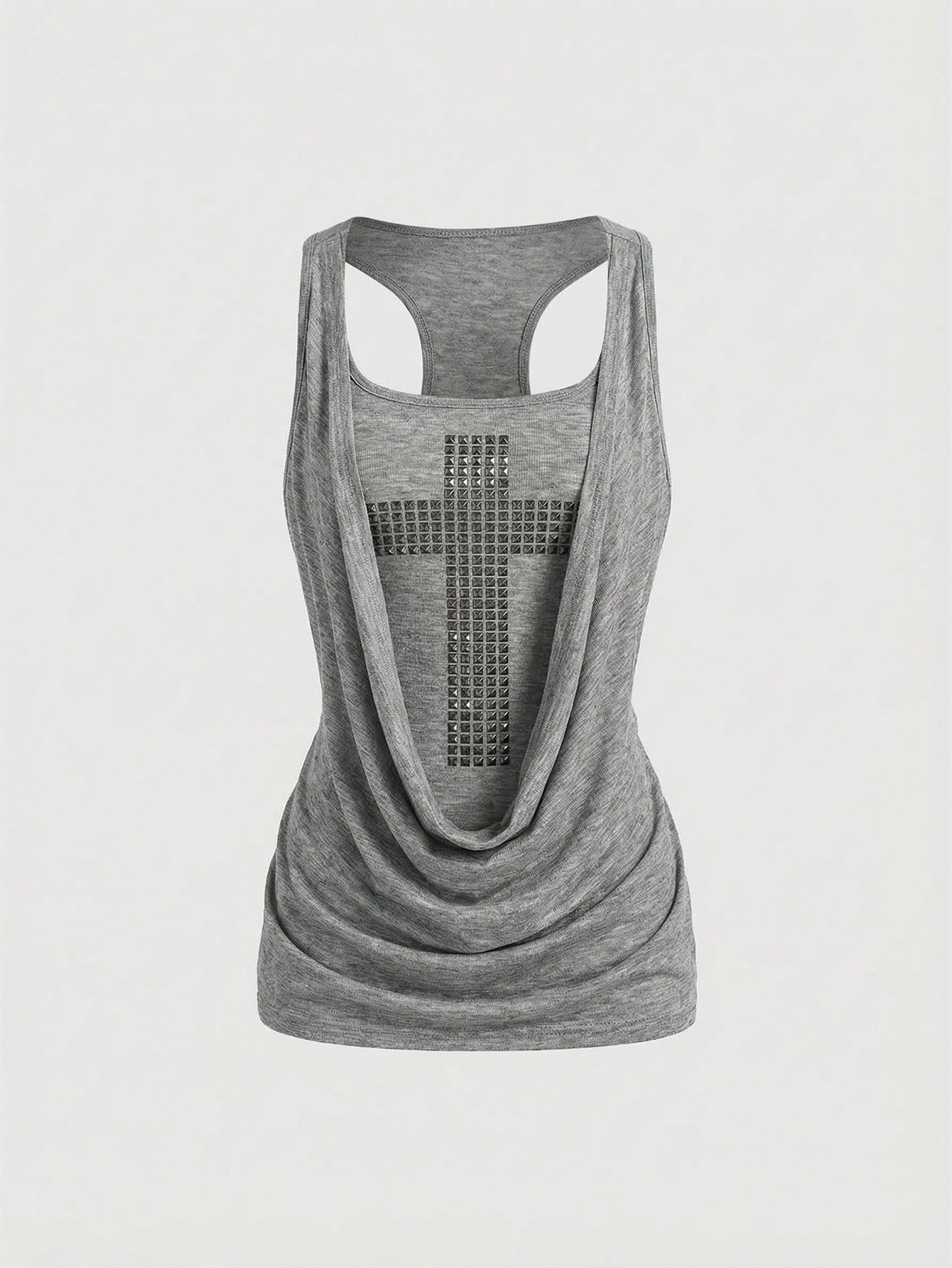 Grunge Punk Camiseta ajustada con cuello profundamente drapeado, cruz de metal y remaches, estilo Millennium Y2K