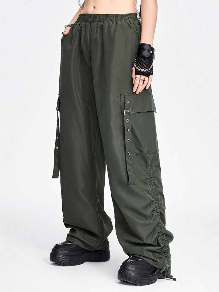 Grunge Punk Pantalones de mujer de pierna recta y ancha con bolsillo y cinta ojal, de estilo casual y de calle para festivales de música