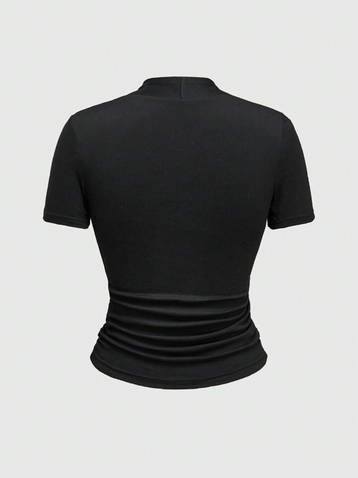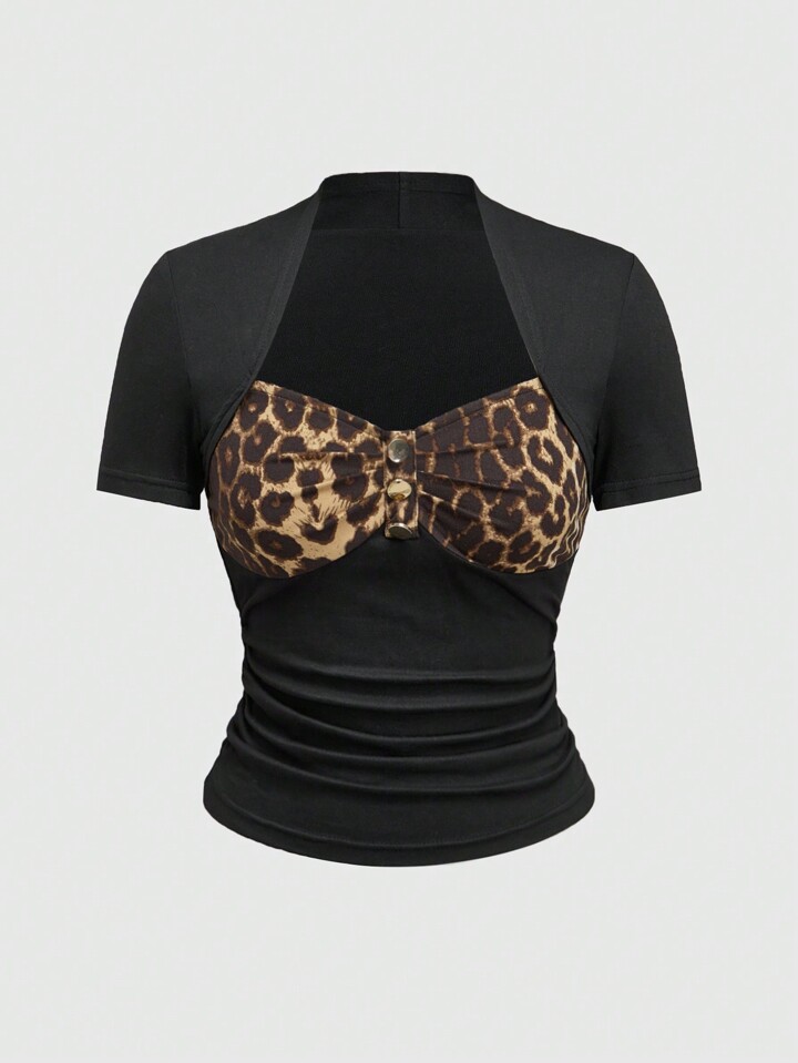Grunge Punk Camiseta elástica de mujer con estampado de leopardo en patchwork, estilo vintage de festival de música