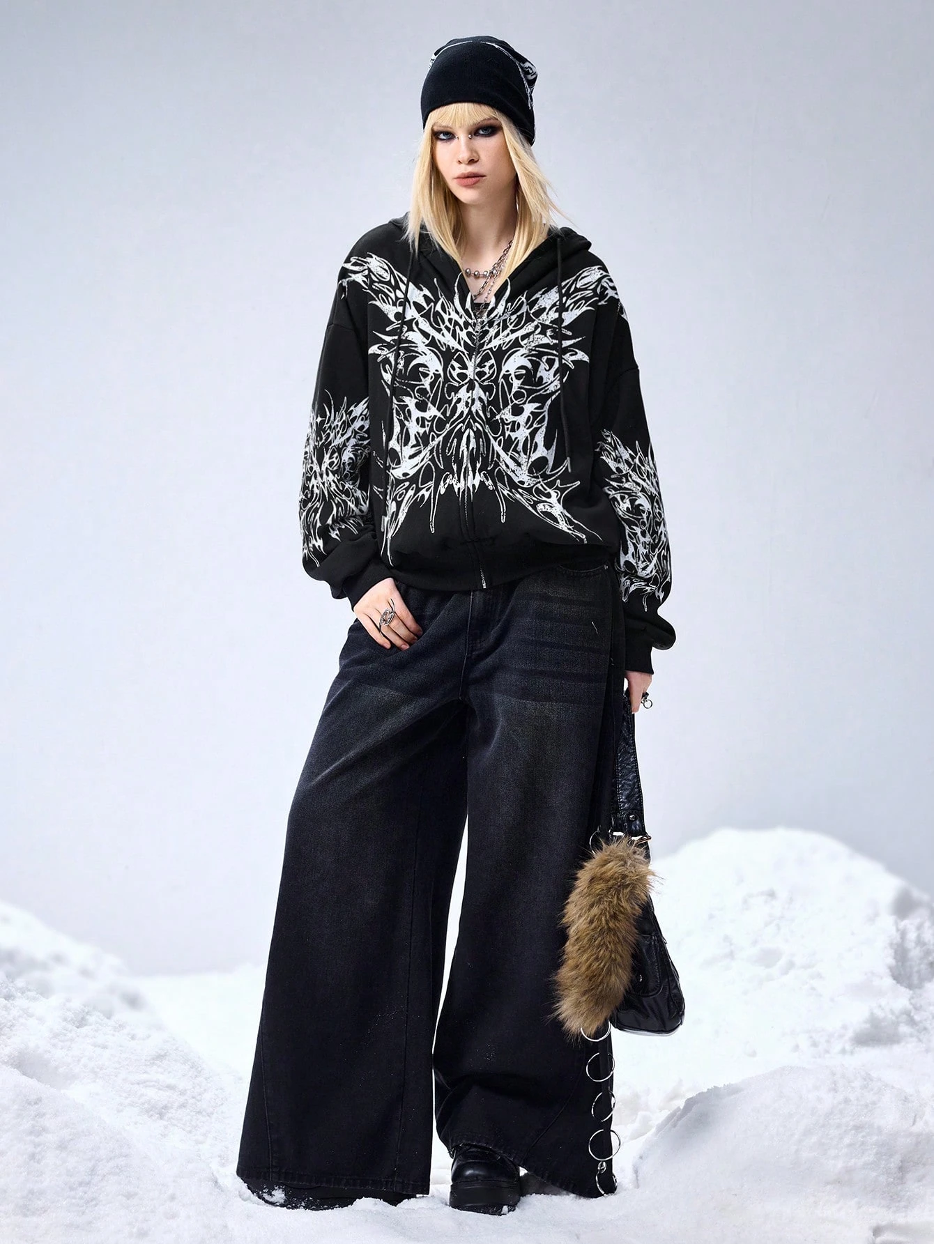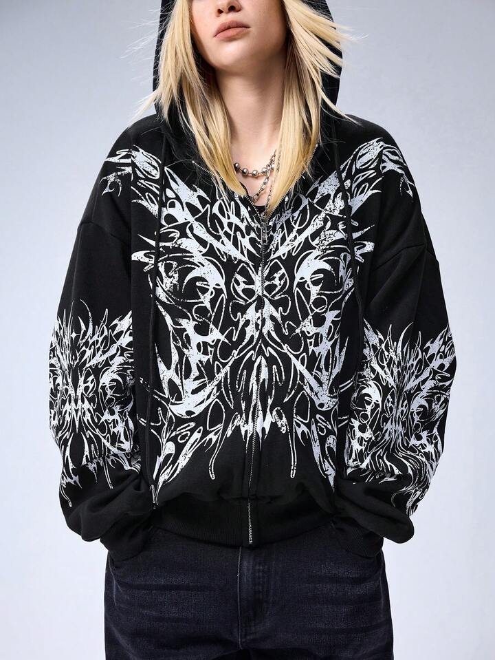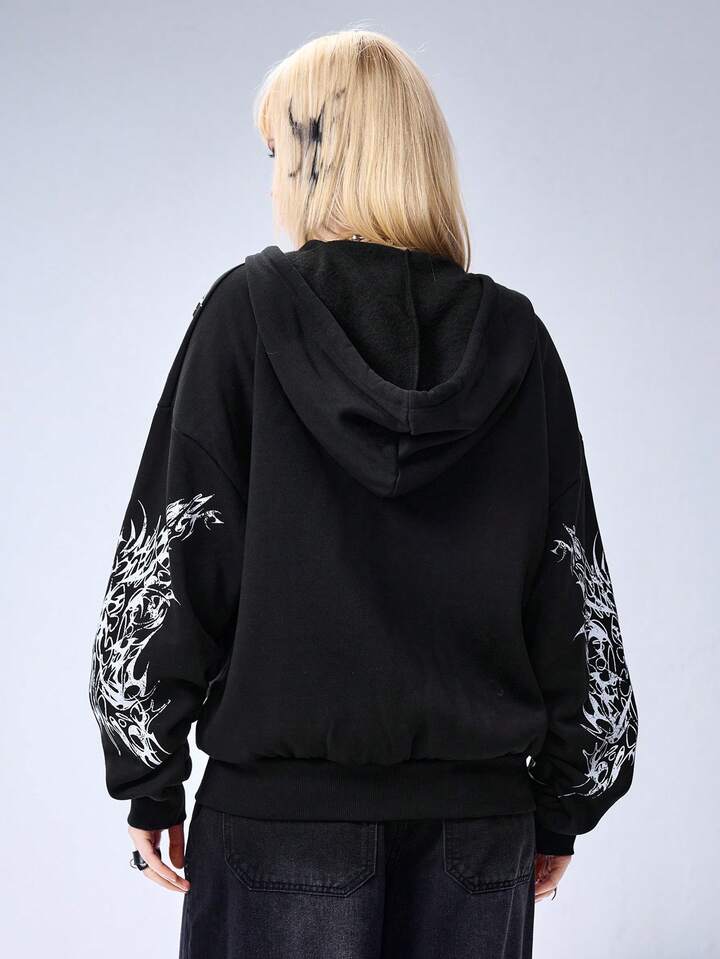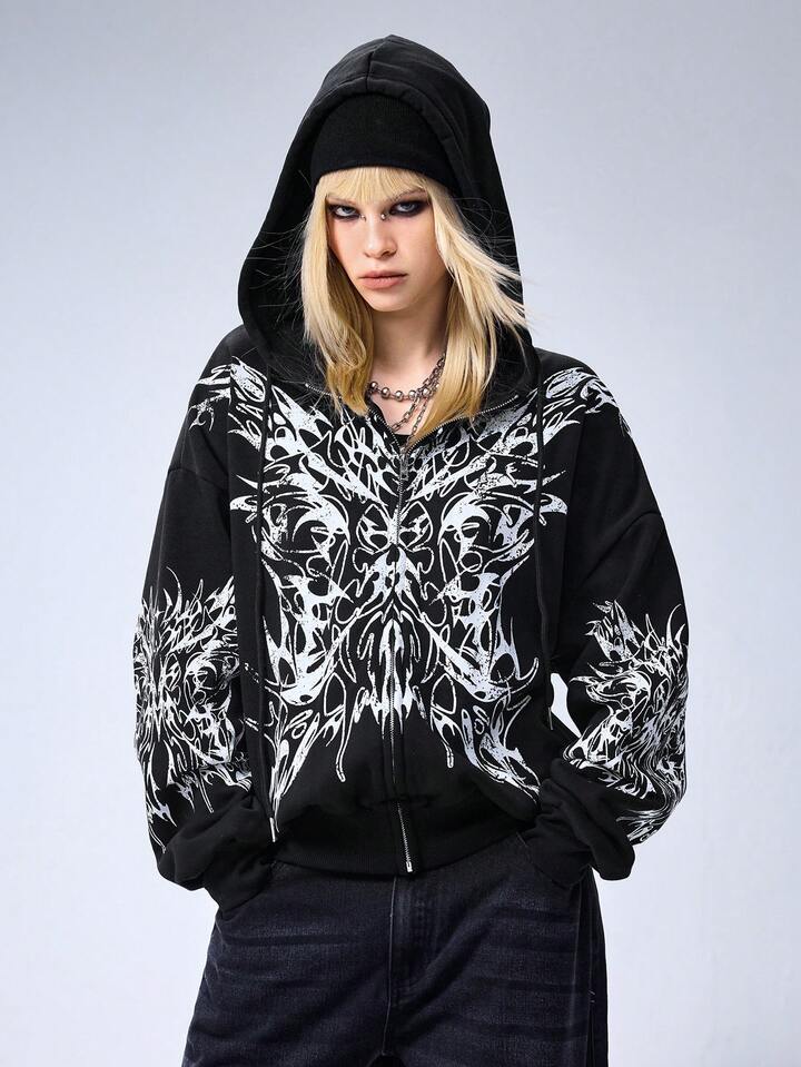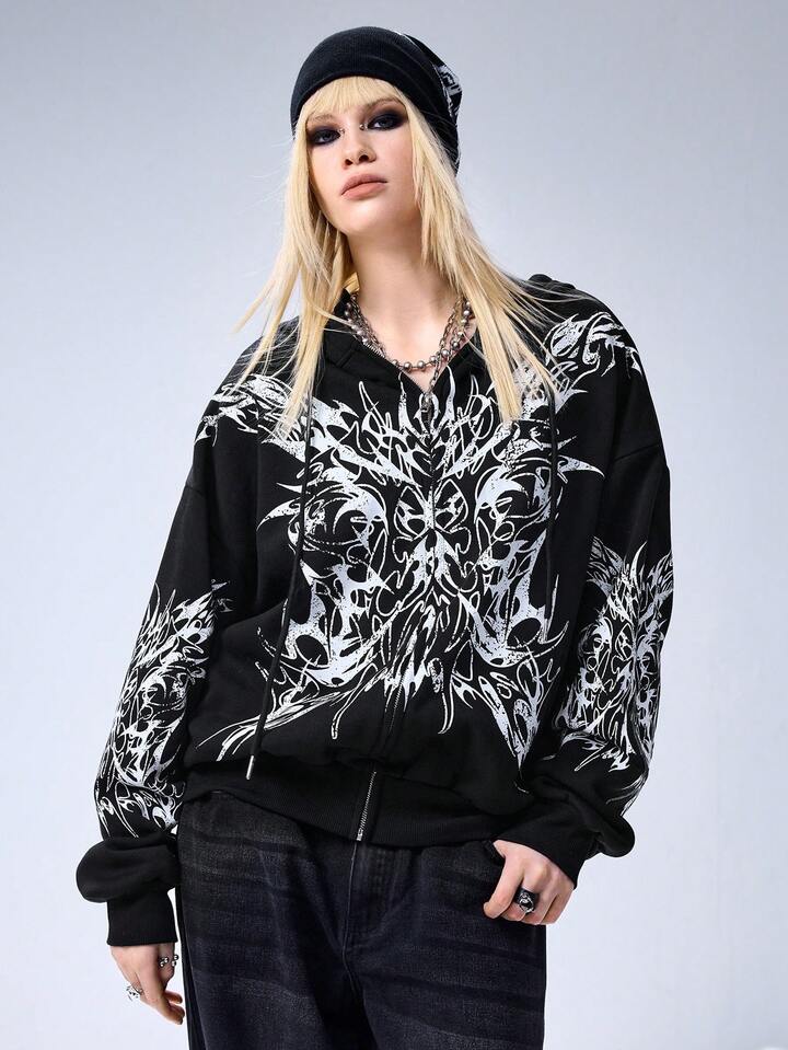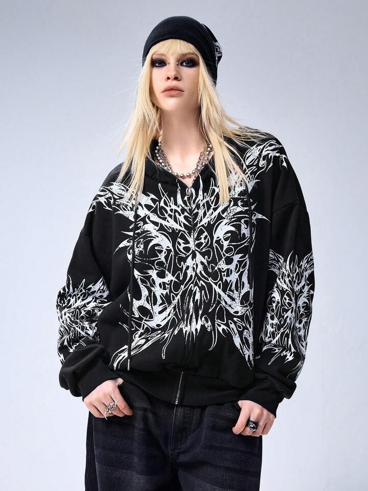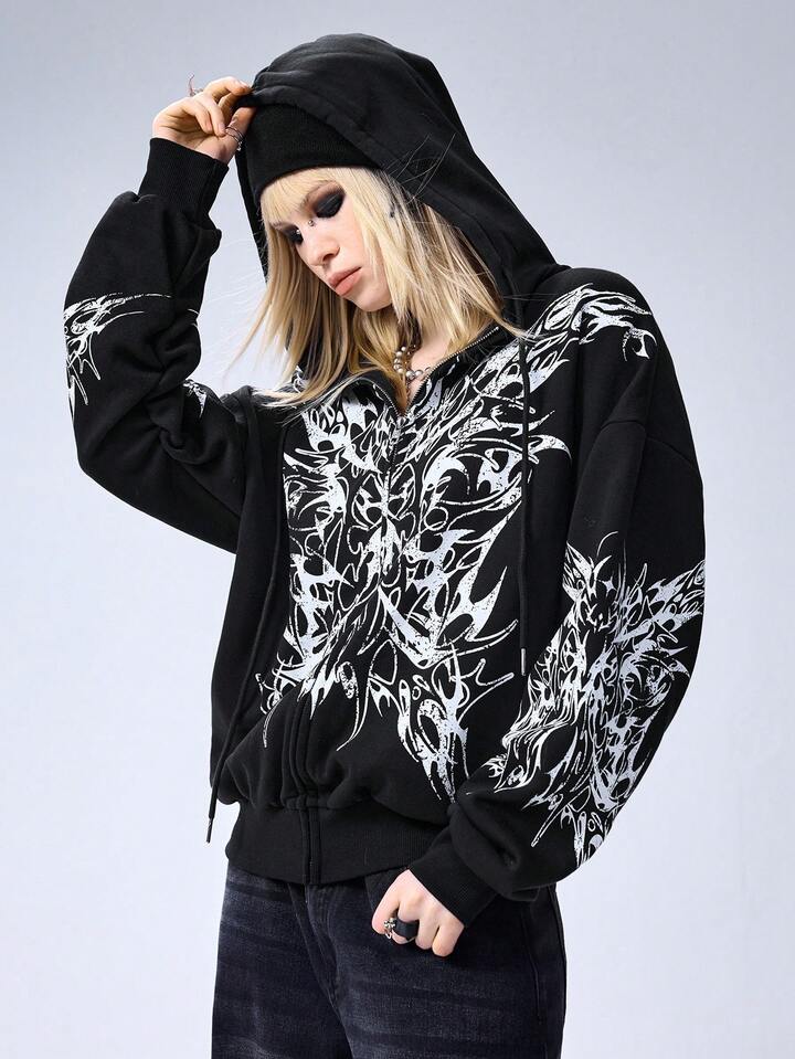 Grunge Punk Sudadera con capucha y cremallera con estampado de espinas para mujer, talla grande