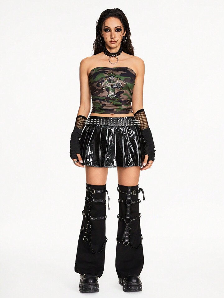 Grunge Punk Falda metalizada con cremallera de estilo callejero y pliegues miniatura de PU para mujeres, escuela