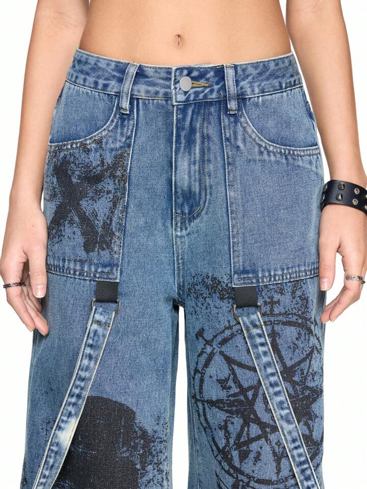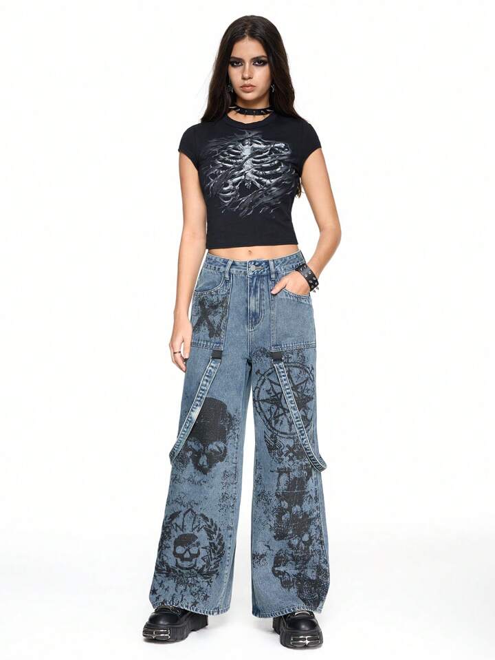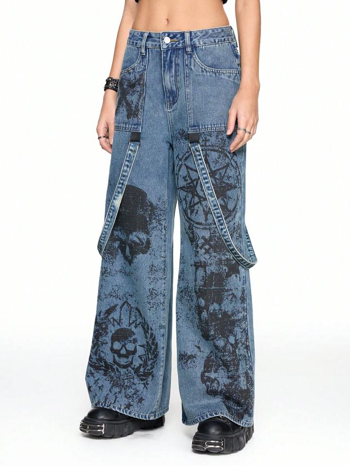Grunge Punk Jeans de novio para mujer estilo PUNK con estampado de calavera deteriorada y salpicaduras de pintura