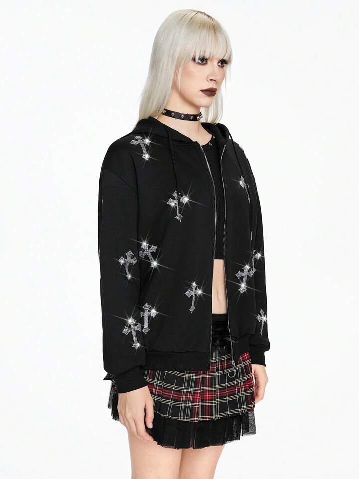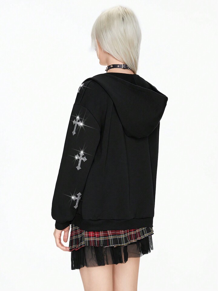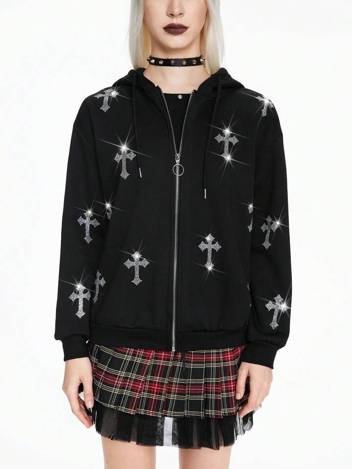 Grunge Punk Sudadera con capucha de estilo PUNK, suelta, con cristales en forma de cruz y forrada térmicamente