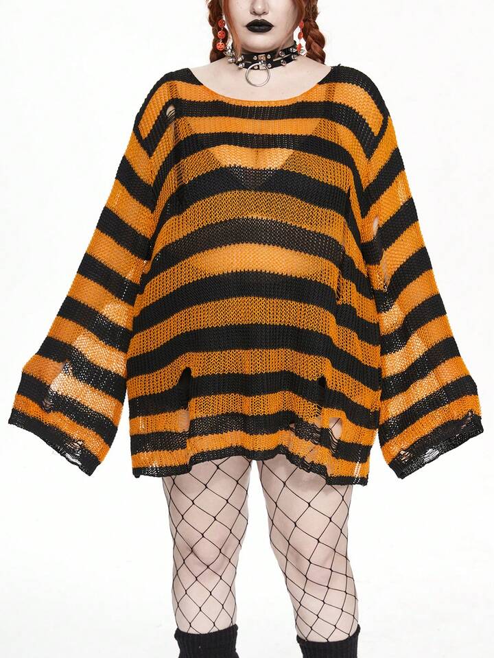 Grunge Punk Suéter negro y naranja de talla grande con rayas tejidas, Halloween