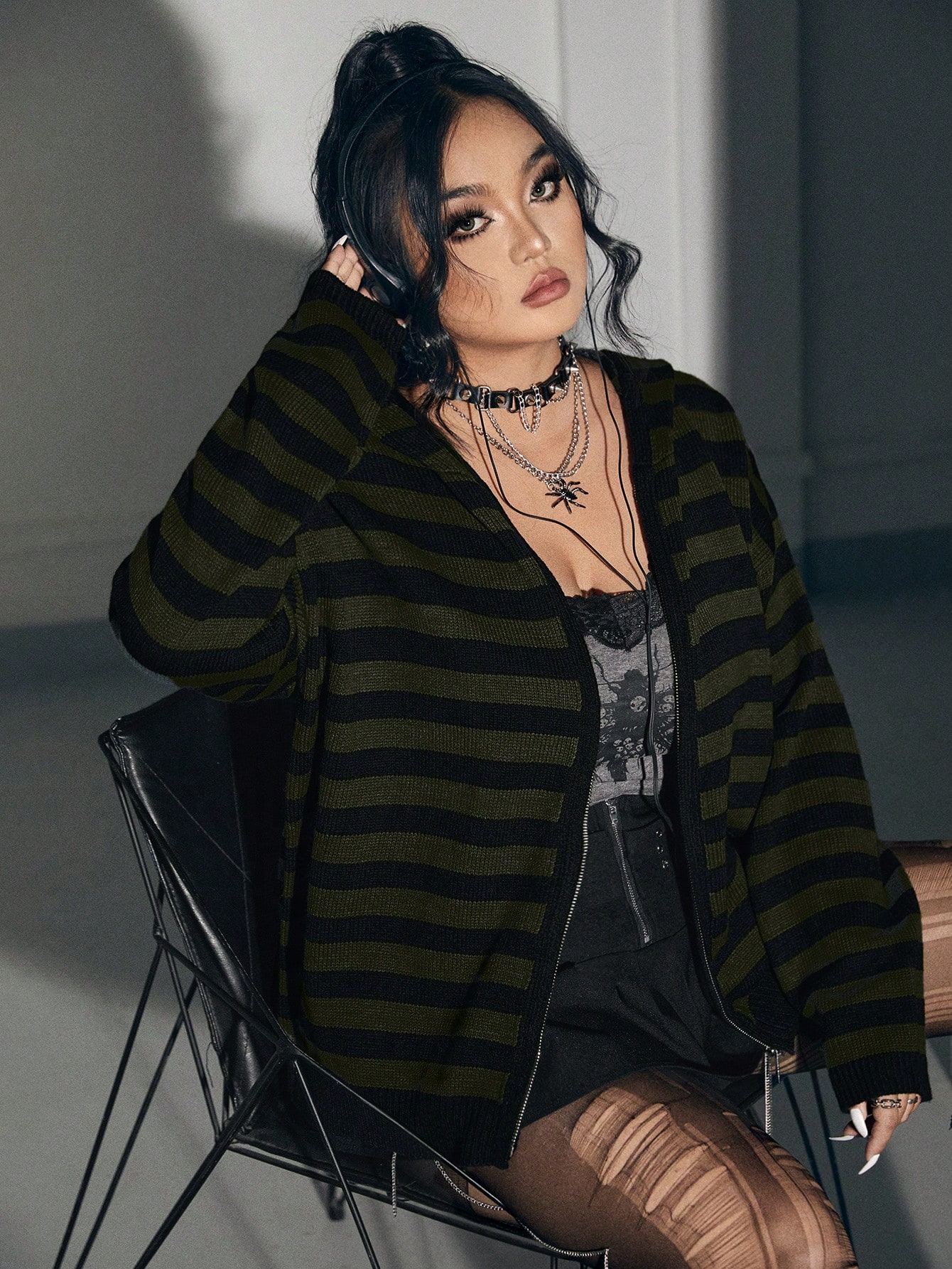 Grunge Punk Cárdigan de punto holgado con cremallera y rayas de contraste en talla grande