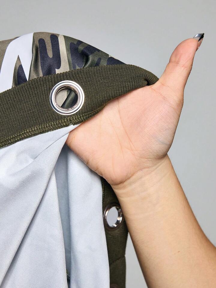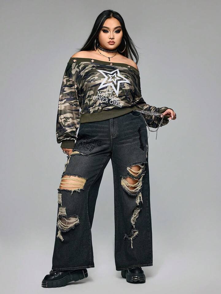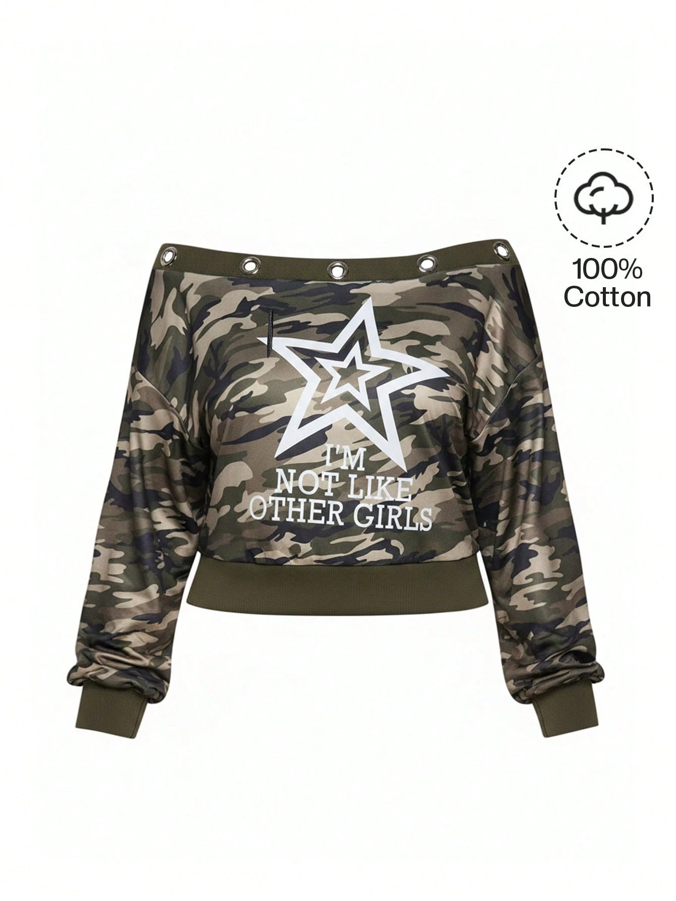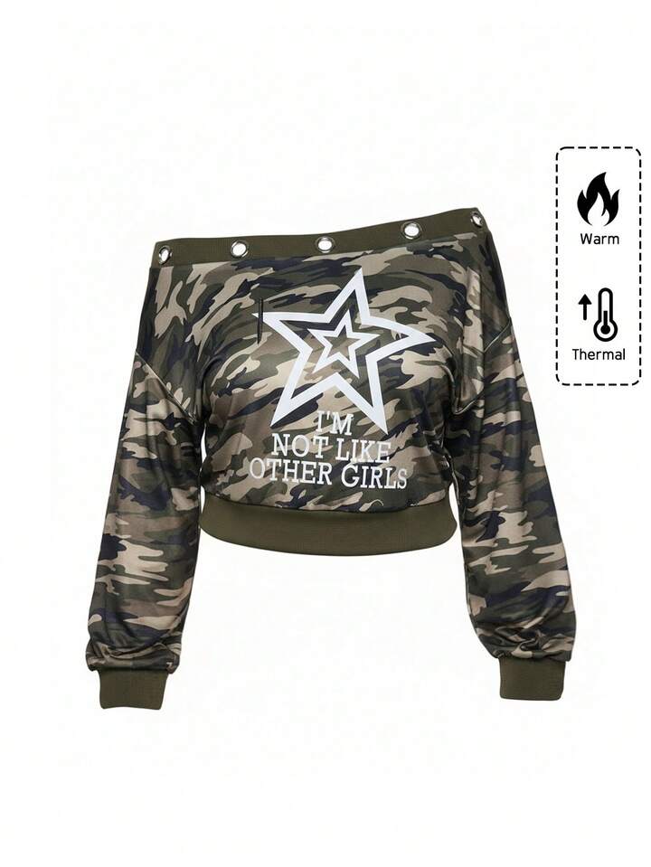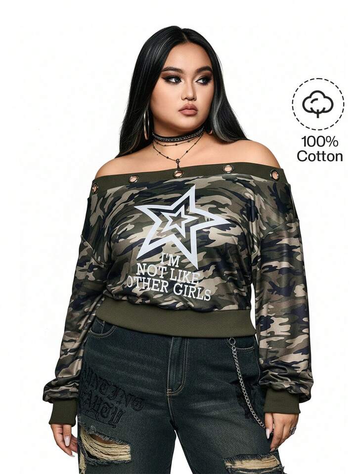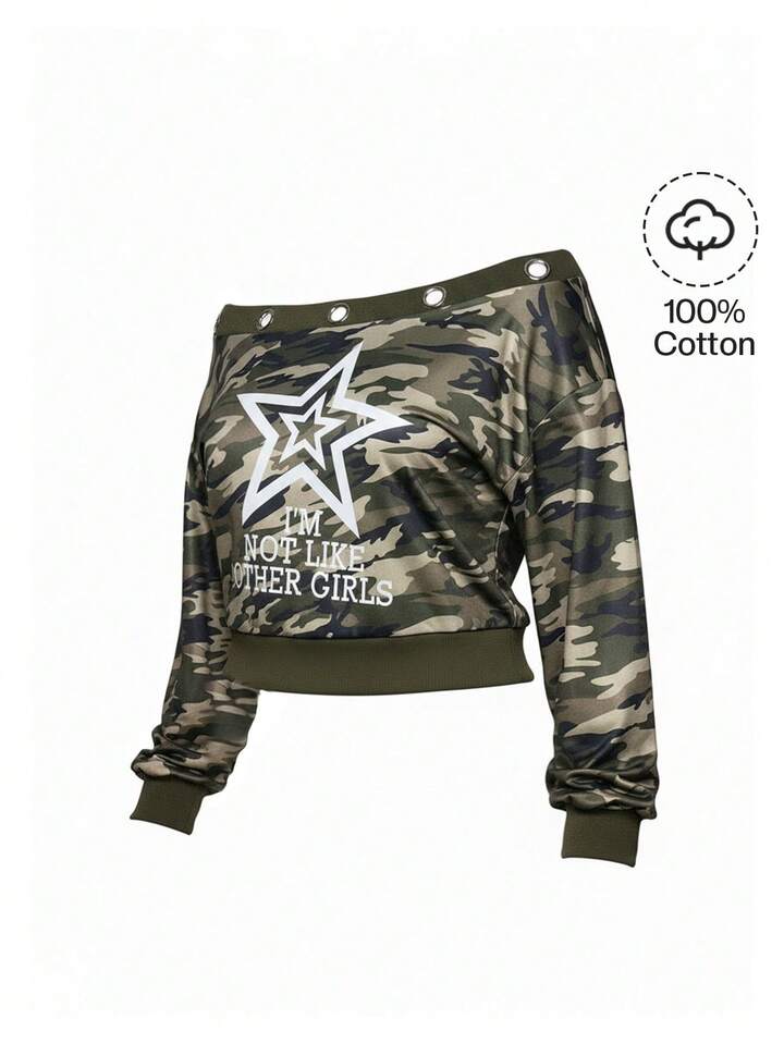 Grunge Punk Sudadera holgada con estampado de camuflaje, estrella y letras para mujer de talla grande, estilo subcultura Kpop Y2K y punk, moda urbana para otoño/invierno