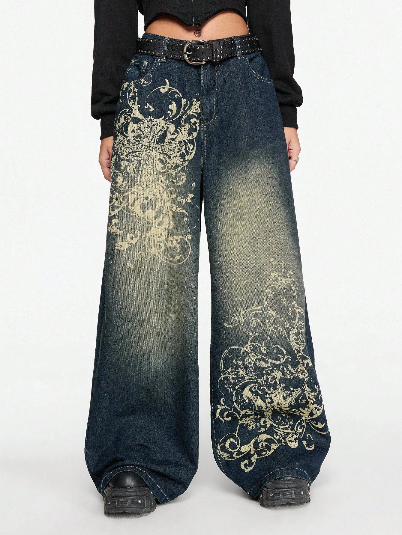 Grunge Punk Jeans de talla grande con ajuste holgado, estilo vintage desgastado y estampado de cruz y vid, estilo callejero