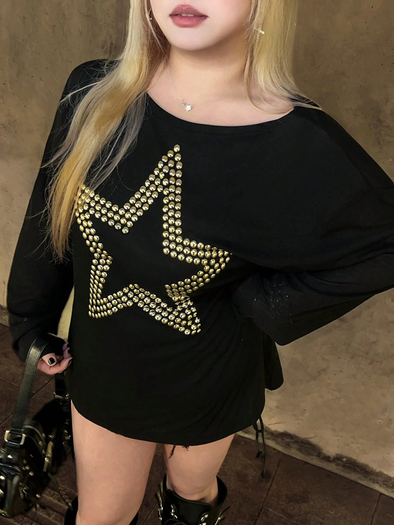 Grunge Punk Camiseta de manga larga con cuello de pico, de talla grande, corte holgado, con estampado de estrella de cinco puntas, remaches y rhinestones, estilo punk