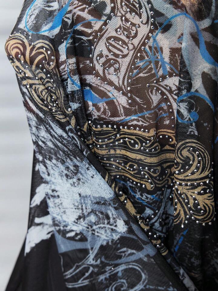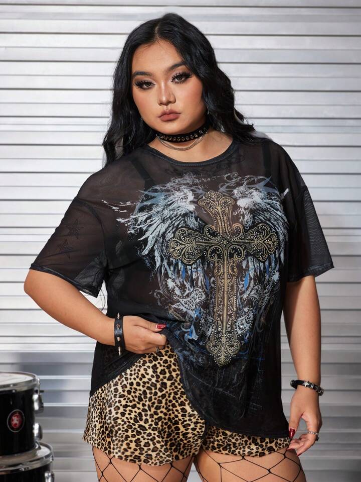 Grunge Punk Parte superior de malla transparente con bloqueo de colores, piedras rhinestone y estampado de cruz y vid para talla grande, ideal para verano