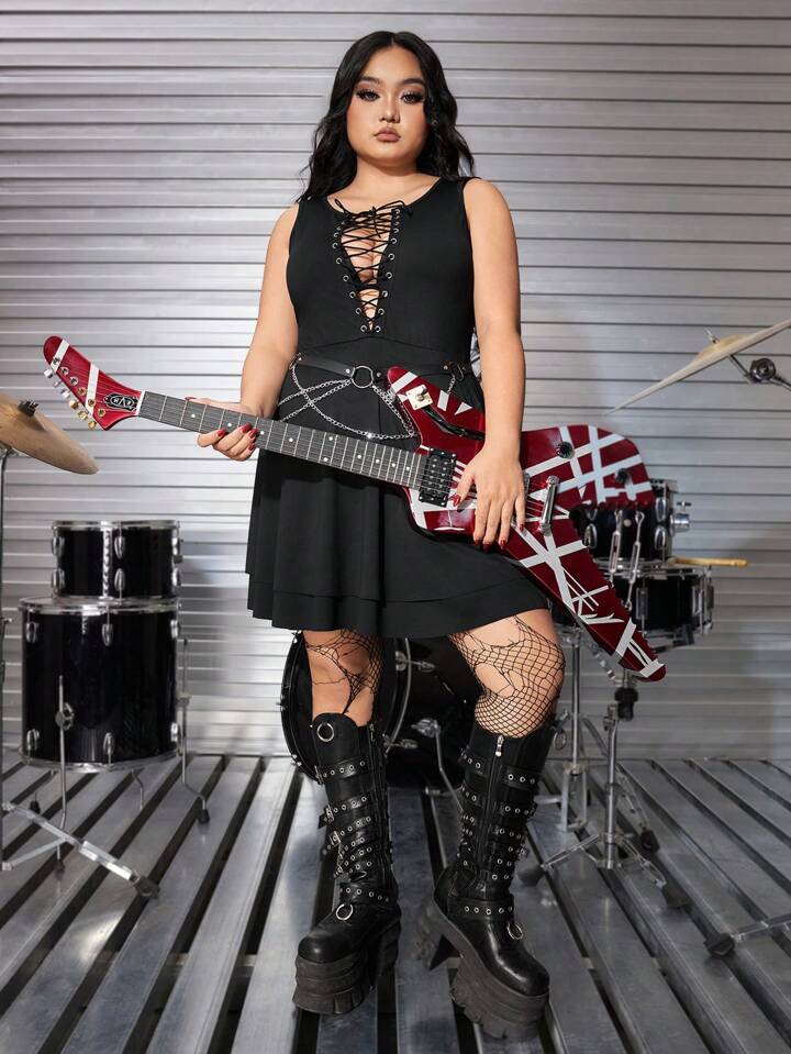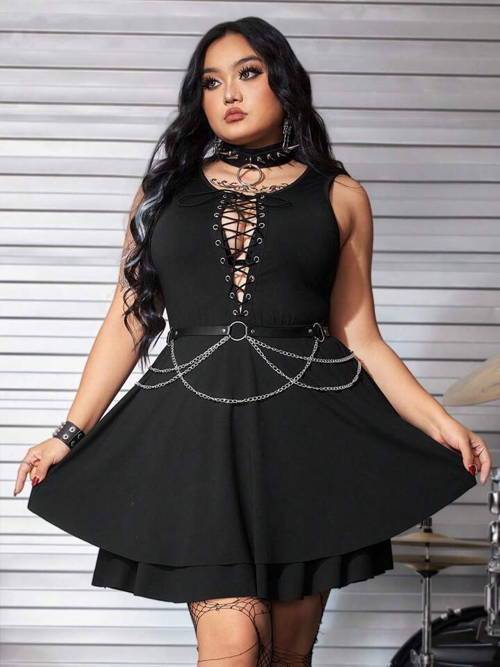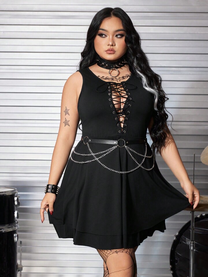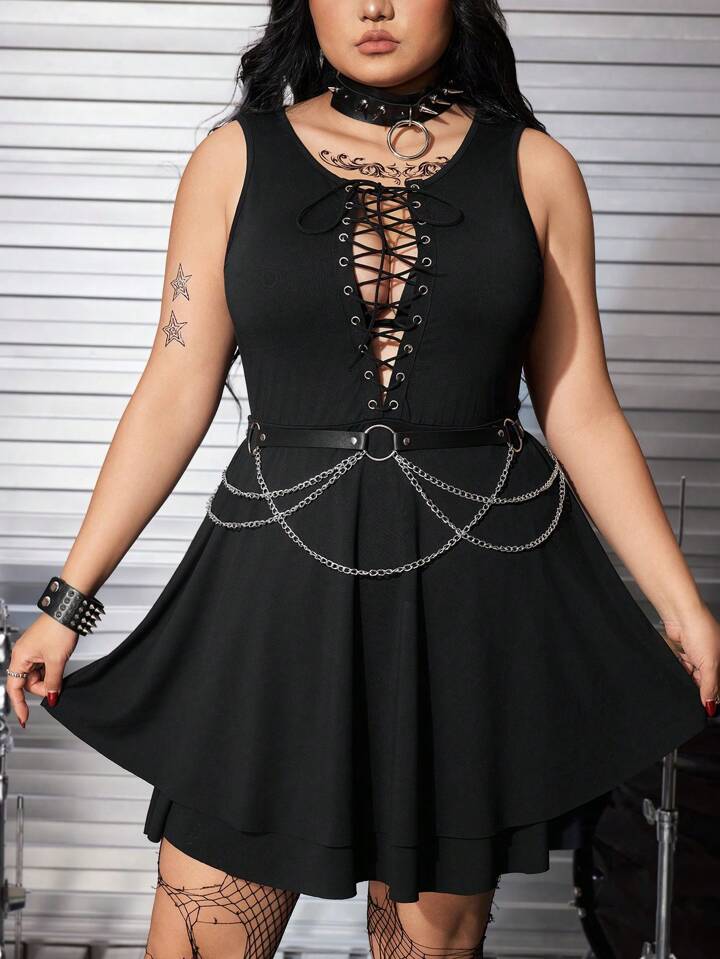 Grunge Punk Vestido sexy de línea A con cadena metálica decorativa y cordón en la cintura para talla grande, perfecto para el verano